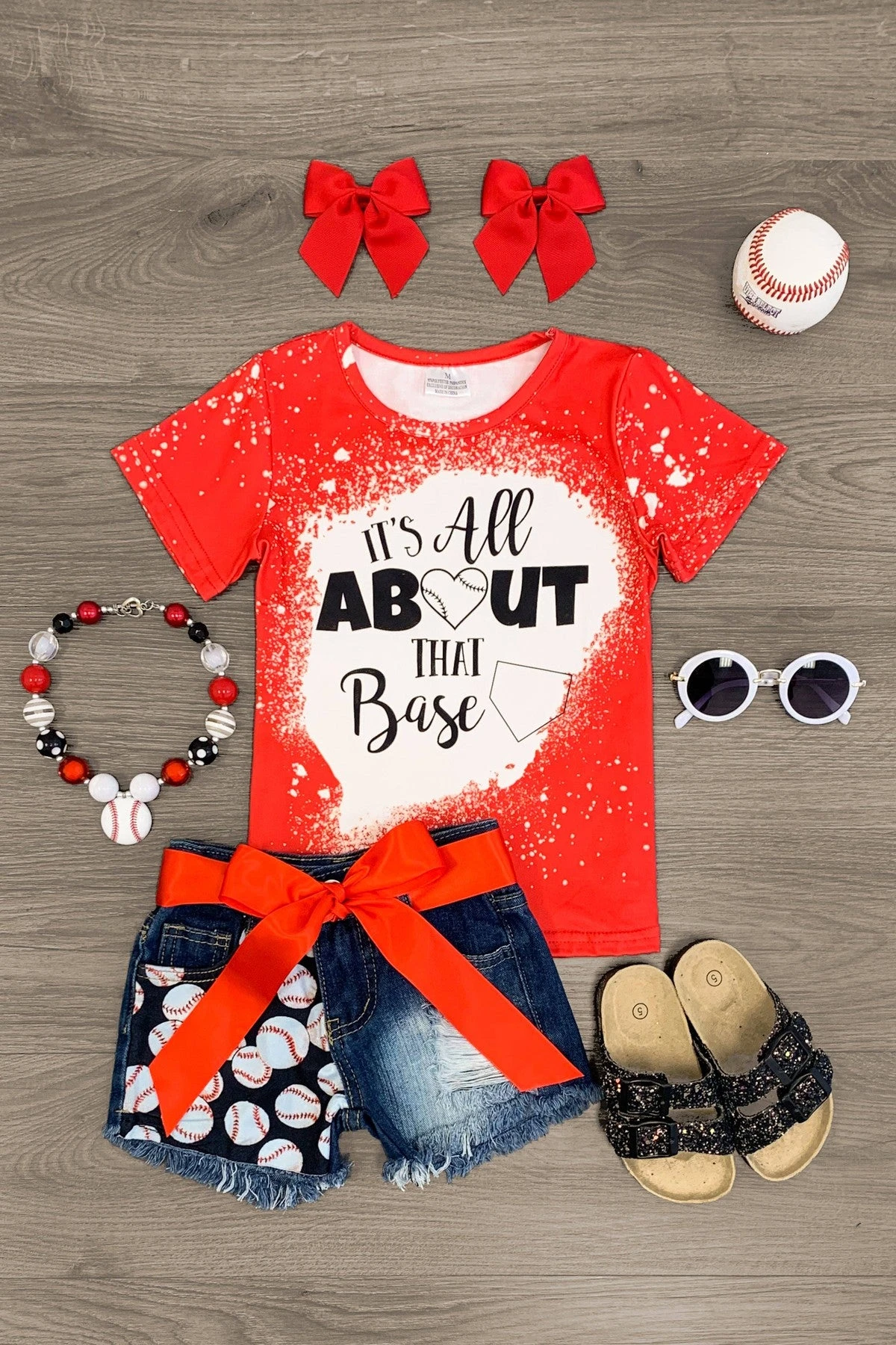 You little one is sure to be the cutest fan at the ballpark in this “All About That Base” Red Denim Short Set for girls. This red short sleeve top looks adorable paired with the distressed denim shorts. The adjustable waistband and belt helps with comfort and fit and can be great for on the go. The top and shorts can be worn as a set and paired with our SIP bows or keep it laid back with a pair of sunglasses, she’ll shine bright in this kids ensemble.