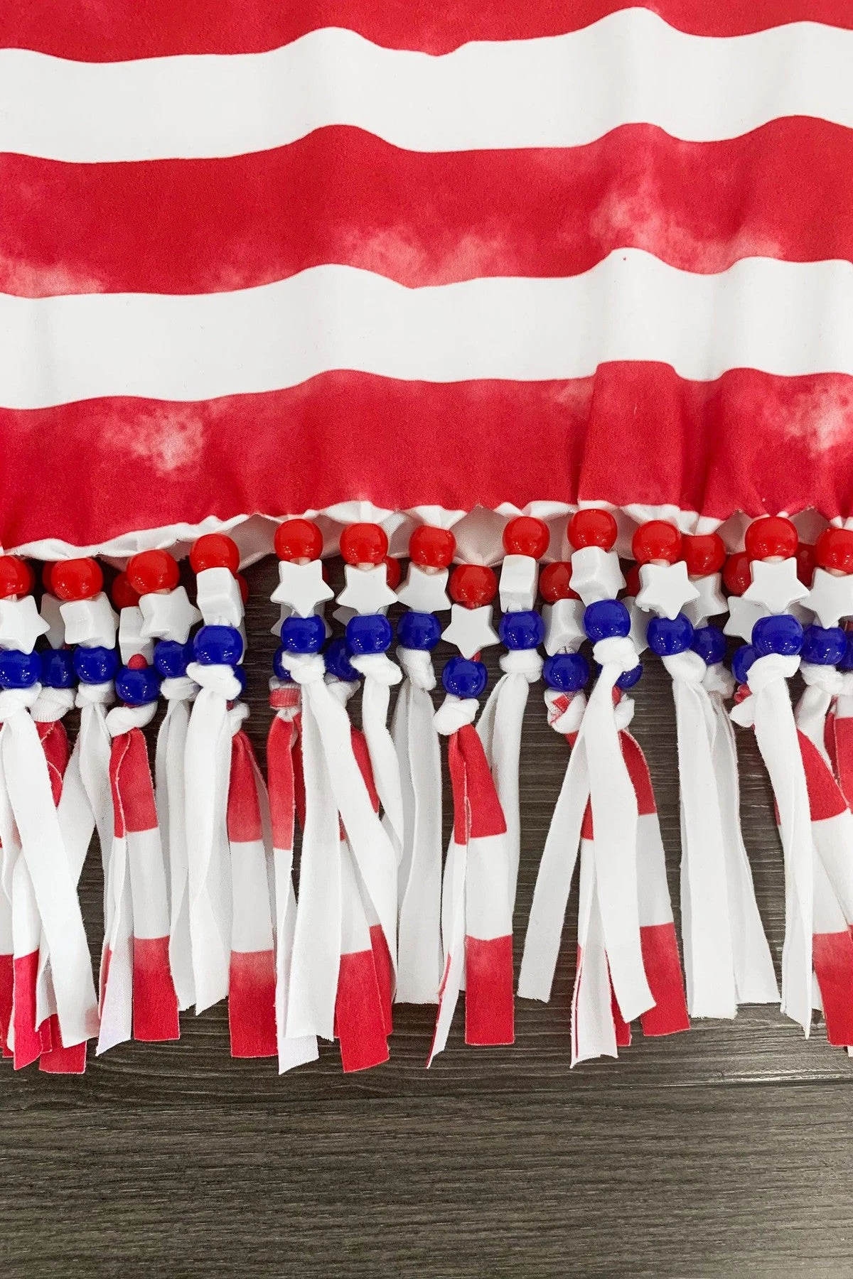 Red, white & blue will look so good on you! This American Flag Beaded Fringe Top features an allover American flag design with beaded fringe detailing. The top is made from soft and breathable fabric that will keep her comfy during all adventures. She can pair it with a variety of bows & our matching sandals for the perfect look!