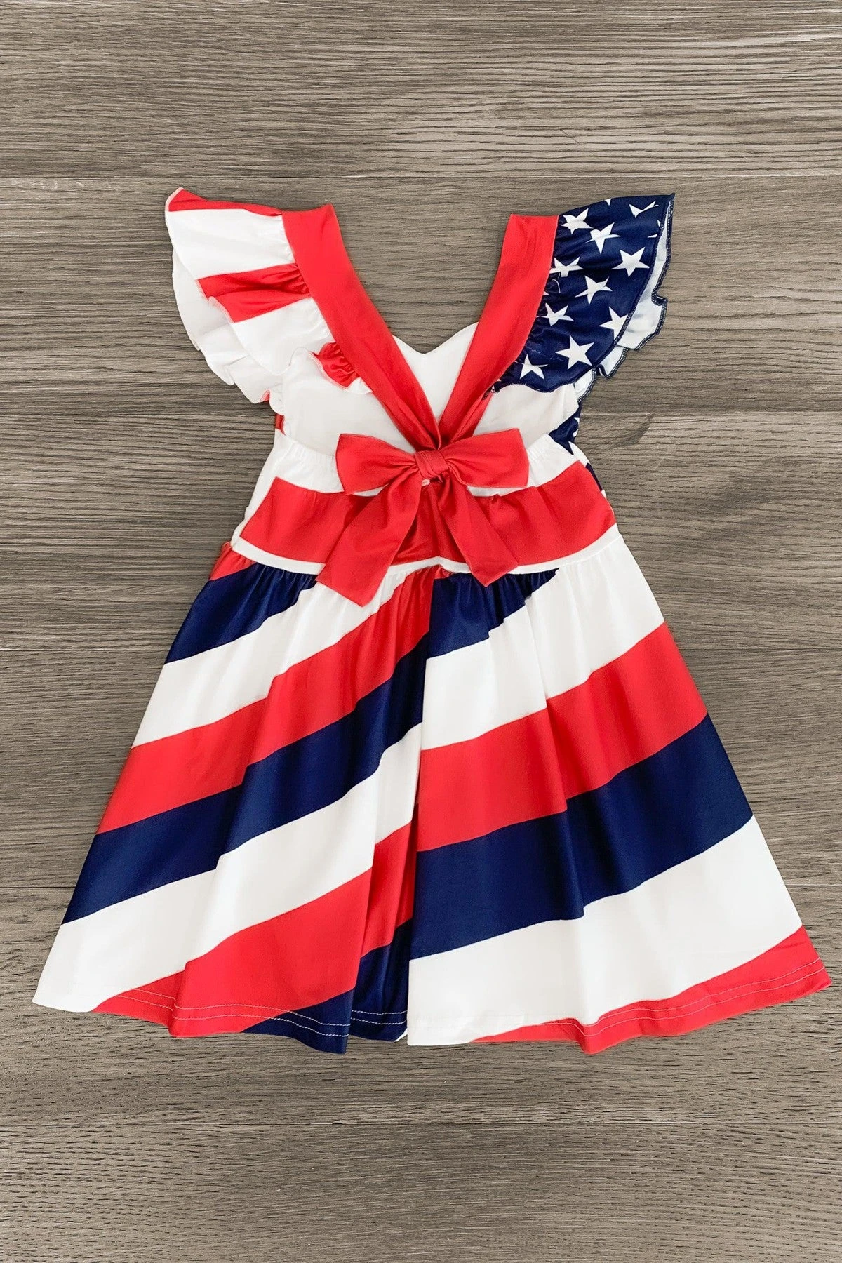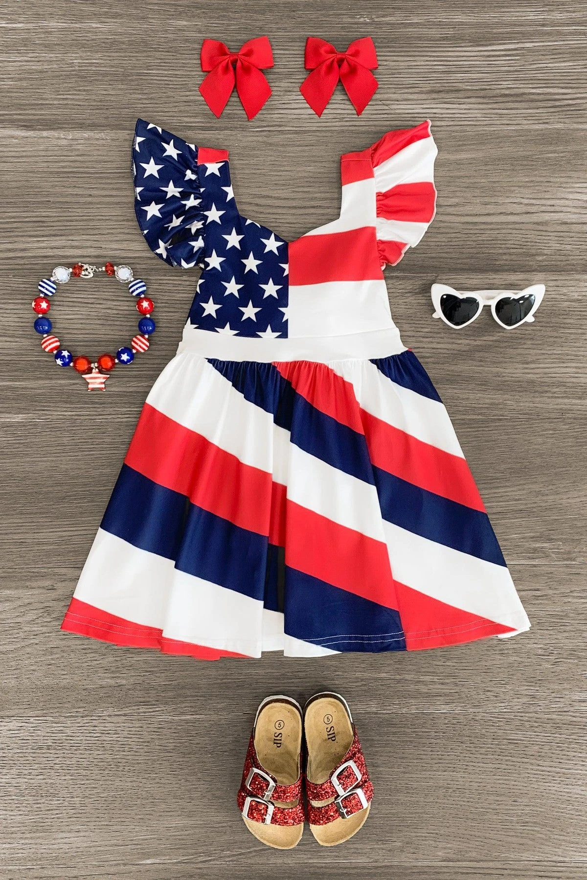 From backyard parties to fireworks at the park with family and friends, this 4th of July American Flag Halter Tie Dress makes a perfectly pretty pick for any occasion. Made from a soft and breathable fabric to let her breeze through the day in ease, the dress features an allover stars & stripes print with ruffle details for a sweet, feminine look. This dress pairs perfectly with our bows or cute sandals & when the weather gets a little cooler, simply layer on a cardigan and tights for an easy weather transition.