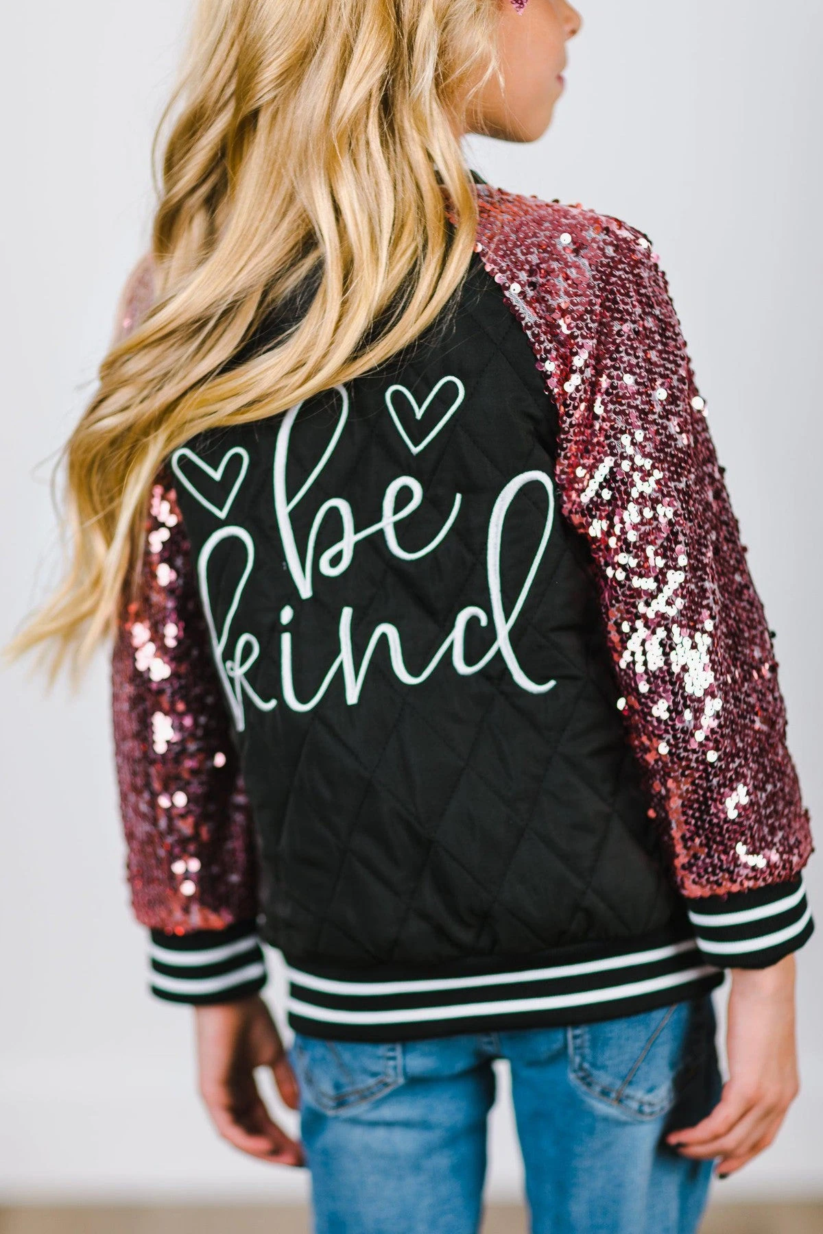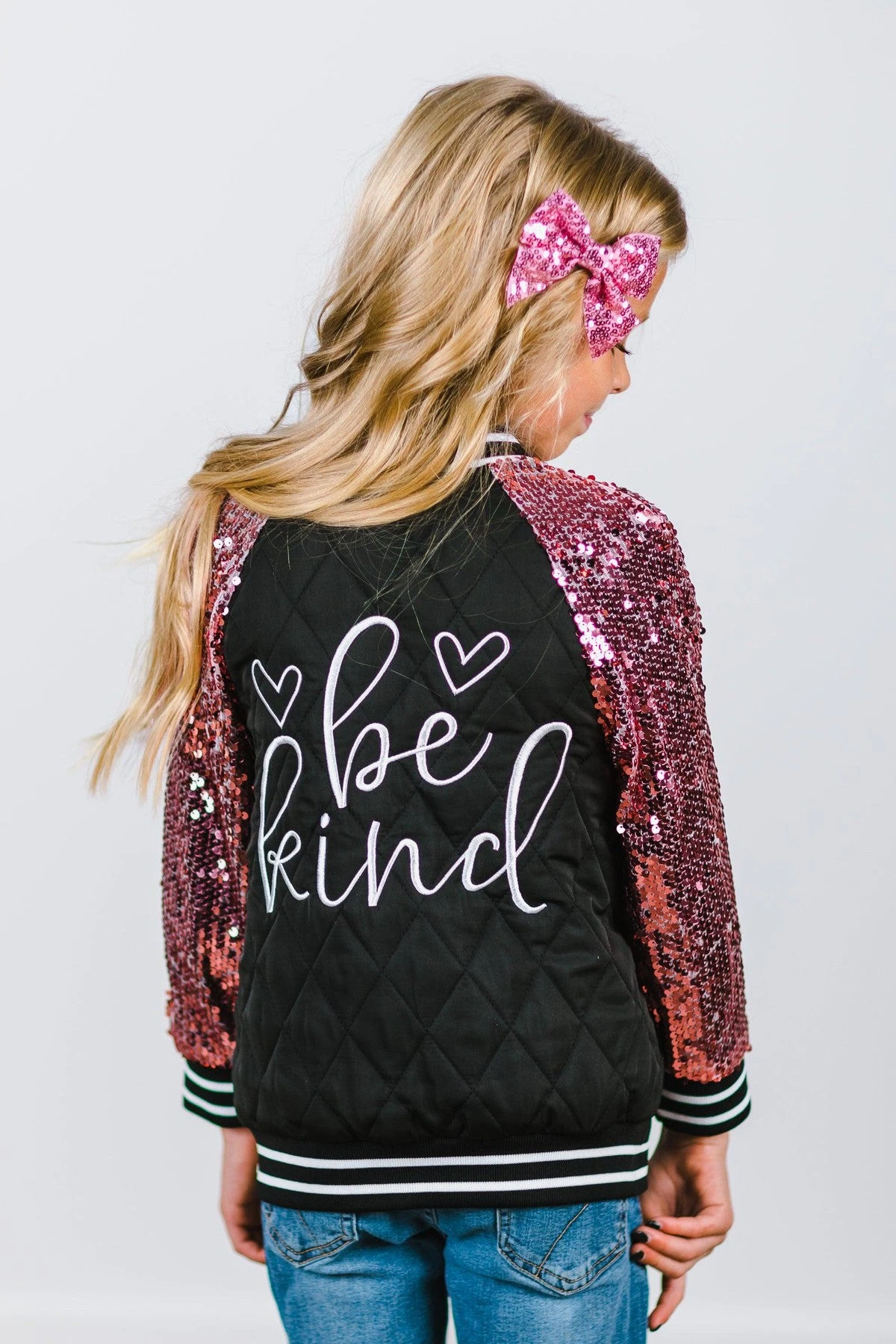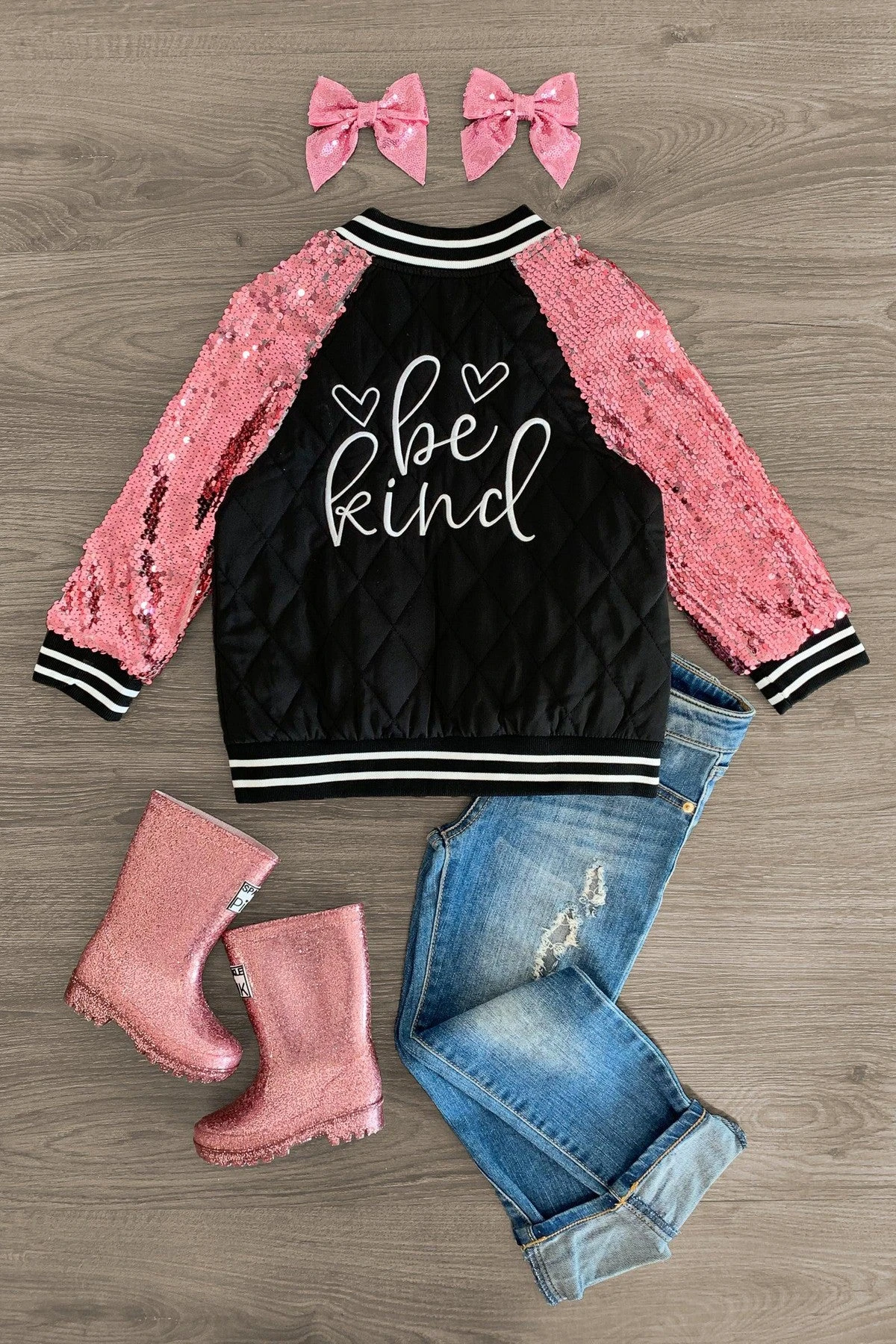 Your gal will love the comfort and cool style this “Be Kind” Black & Pink Sequin Bomber Jacket brings to her cool weather wardrobe. Made from soft & breathable quilted fabric, this girls’ jacket feels soft against her skin, while the long sleeves offer her a cozy fit. Pair this jacket with our matching bows or booties for the perfect look!