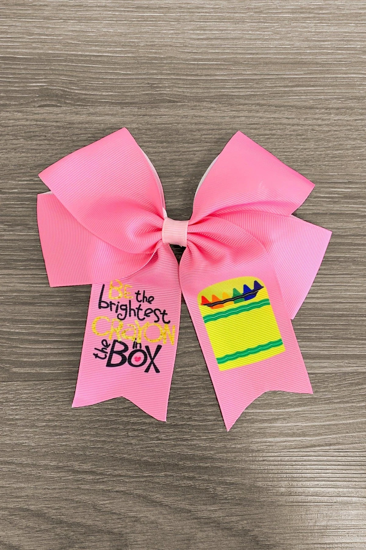 Add cute detail to her everyday hairstyles with this “Be The Brightest Crayon In The Box” Pink Bow. This allover pink designed bow makes a versatile addition to her hair accessories, and is easy to match with any outfit. The girly bow comes attached to an alligator clip that makes it easy to clip into any hairstyle for easy styling. She can wear it with a range of hairstyles, from pigtails to ponytails, for sweet and simple accessorizing.