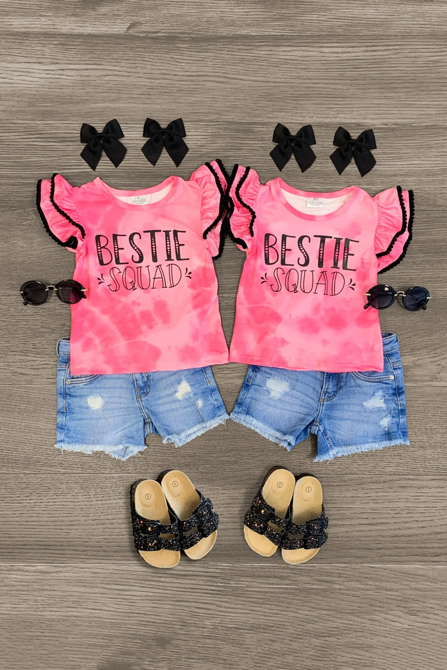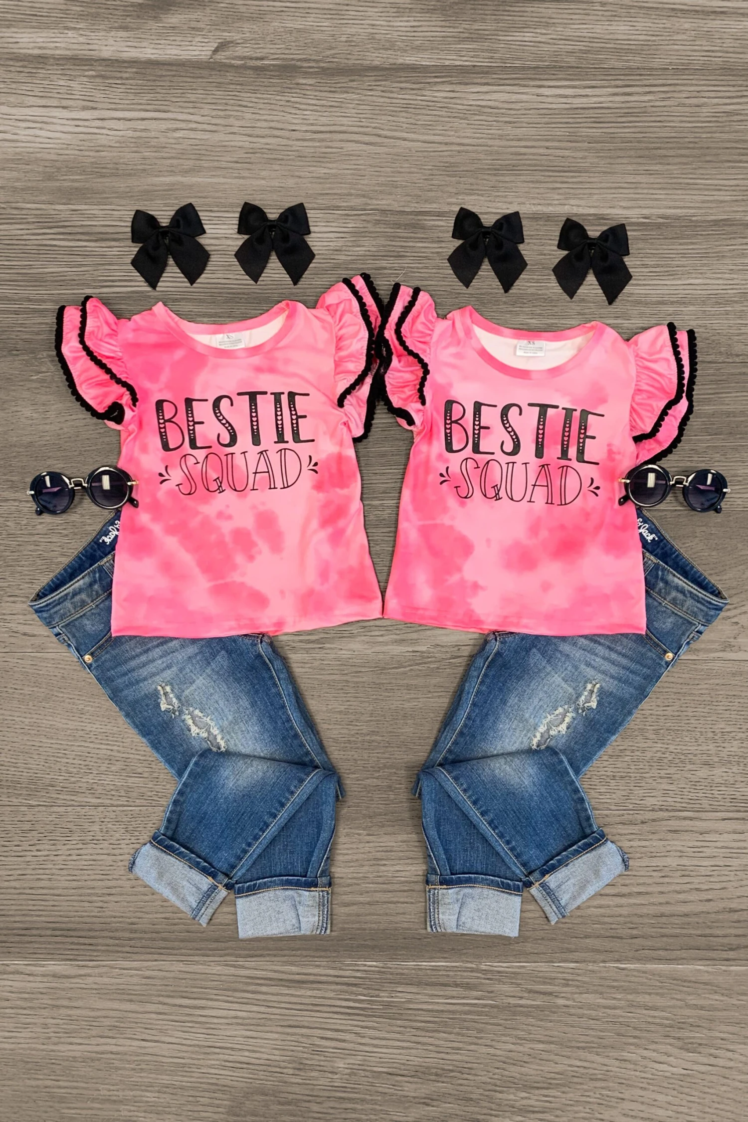 Twinning is winning! Your little one and her BFF will look adorable in our “Bestie Squad” Black & Pink Tops. These short sleeve tops feature pom pom details and “Bestie Squad” embossed on the front. In a versatile pink tie dye print, this top is made from soft and breathable fabric that will keep her comfy during all adventures. She can pair it with a variety of SIP bottoms & our sandals for the perfect look!