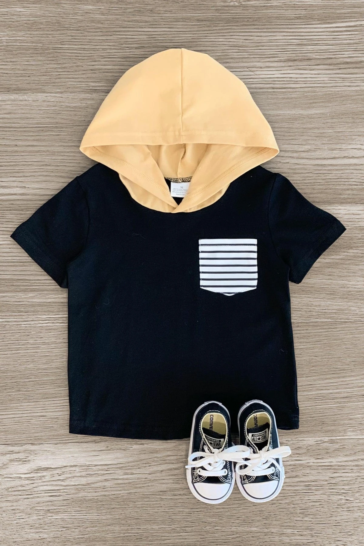 Your little one will look so handsome in our Black & Tan Hooded T-Shirt. Made from a lightweight fabric, this short sleeve shirt ensures he stays comfy through out the day. The top features an allover black design with a tan hood and a striped pocket, making it a perfect summer top. This top makes a great pairing piece with a variety of his bottoms, he can also layer it under his zip-up jackets to stay cozy on the cooler days. Check out our boys’ collection for more tops like this one!
