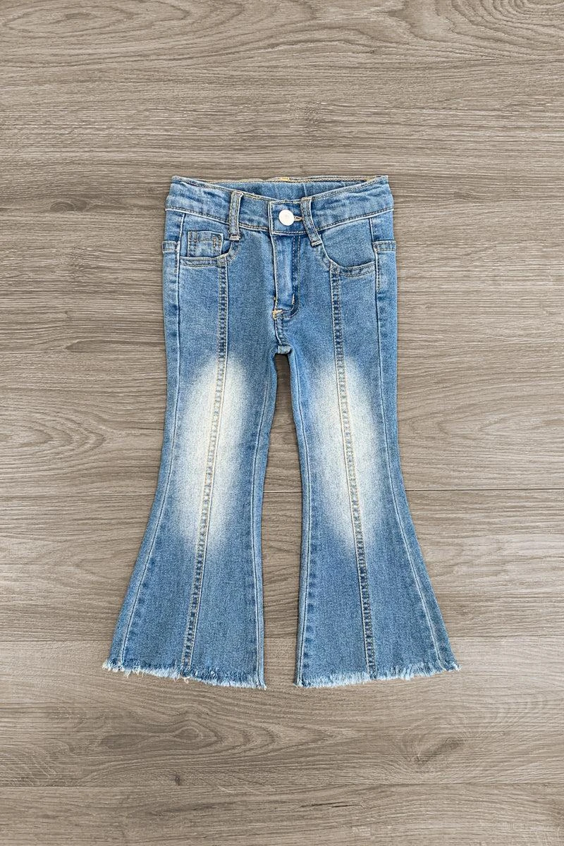 Your little girl will skip into sweet style with the Blue Flare Jeans. These pants feature a soft and breathable construction with a hint of spandex, providing a perfect fit during any activity. Sporting a comfortable waistband for a secure fit, as well as fun washed detailing, she can pair these fun pants with a variety of SIP tops or our booties for the perfect look!