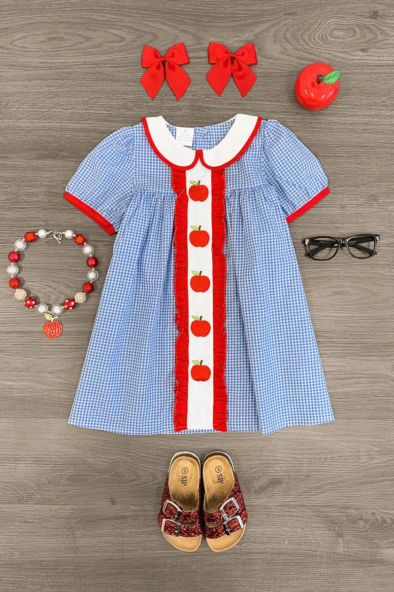 - Girls’ dress features an allover blue gingham design with cute apples down the front
