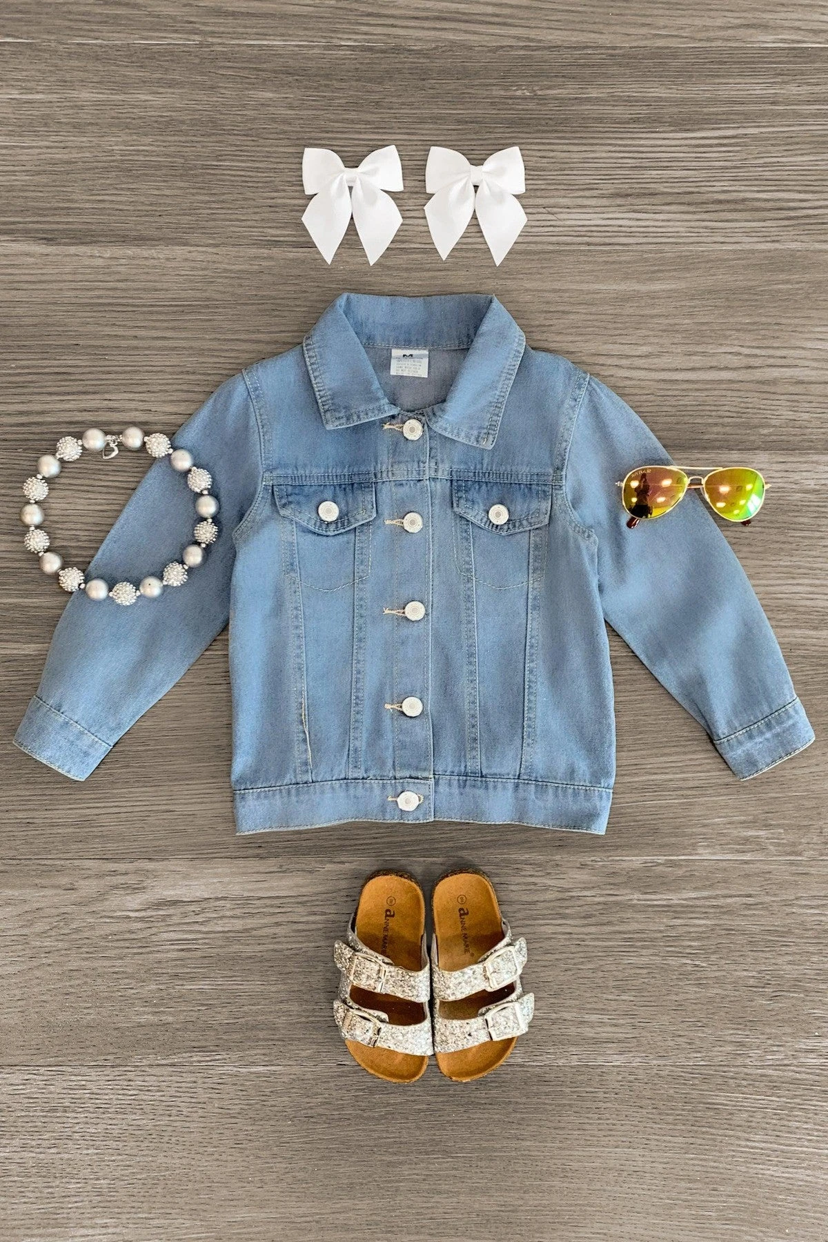 Your gal will love the comfort and cool style this Blue Jean Denim Jacket brings to her cool weather wardrobe. Made from soft & breathable fabric, this girls’ jacket feels soft against her skin, while the long sleeves offer her a cozy fit. Pair this jacket with our matching bows or booties for the perfect look!