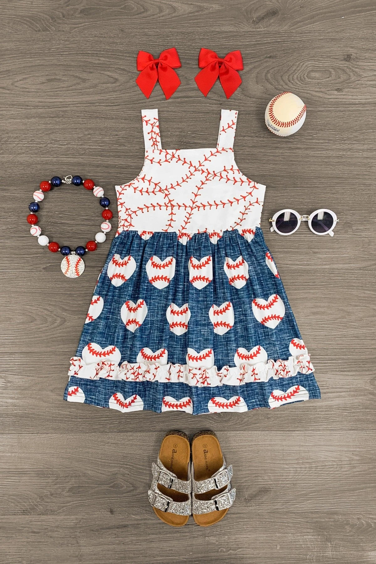 Your little one is going to be the cutest gal at the ballpark in our Blue & White Baseball Heart Dress. Crafted from a soft & breathable fabric to let her breeze through her day in ease, this tank sleeve dress is the perfect addition to her wardrobe. It’s decorated with a blue & white baseball design with ruffle details to add a dash of sweetness to her look. She can pair it with sandals and a matching bow for warmer days, or layer with a cardigan and leggings on the cooler ones.