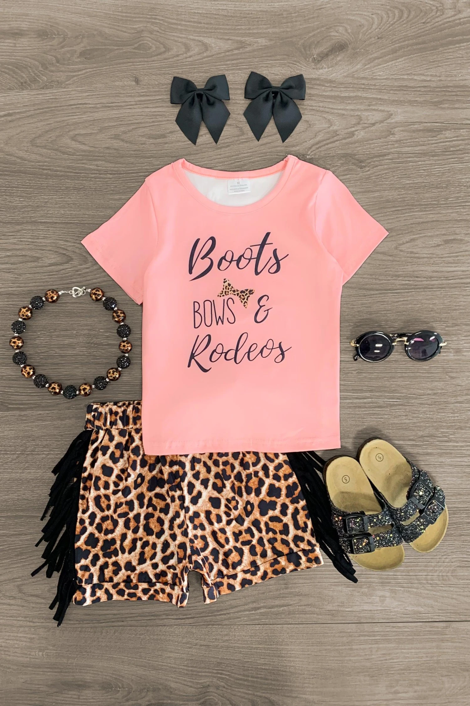 Your little one will breeze through her day in this “Boots, Bows & Rodeos” Leopard Short Set. This girls’ set is styled with a sweet pink top that has a cute saying on the front, making it a staple addition to her everyday wear. The top is paired with matching leopard print shorts that feature black fringe trim on the sides. The adjustable waistband provides a secure fit. She can pair this set with sandals or our fun SIP bows for the perfect look!