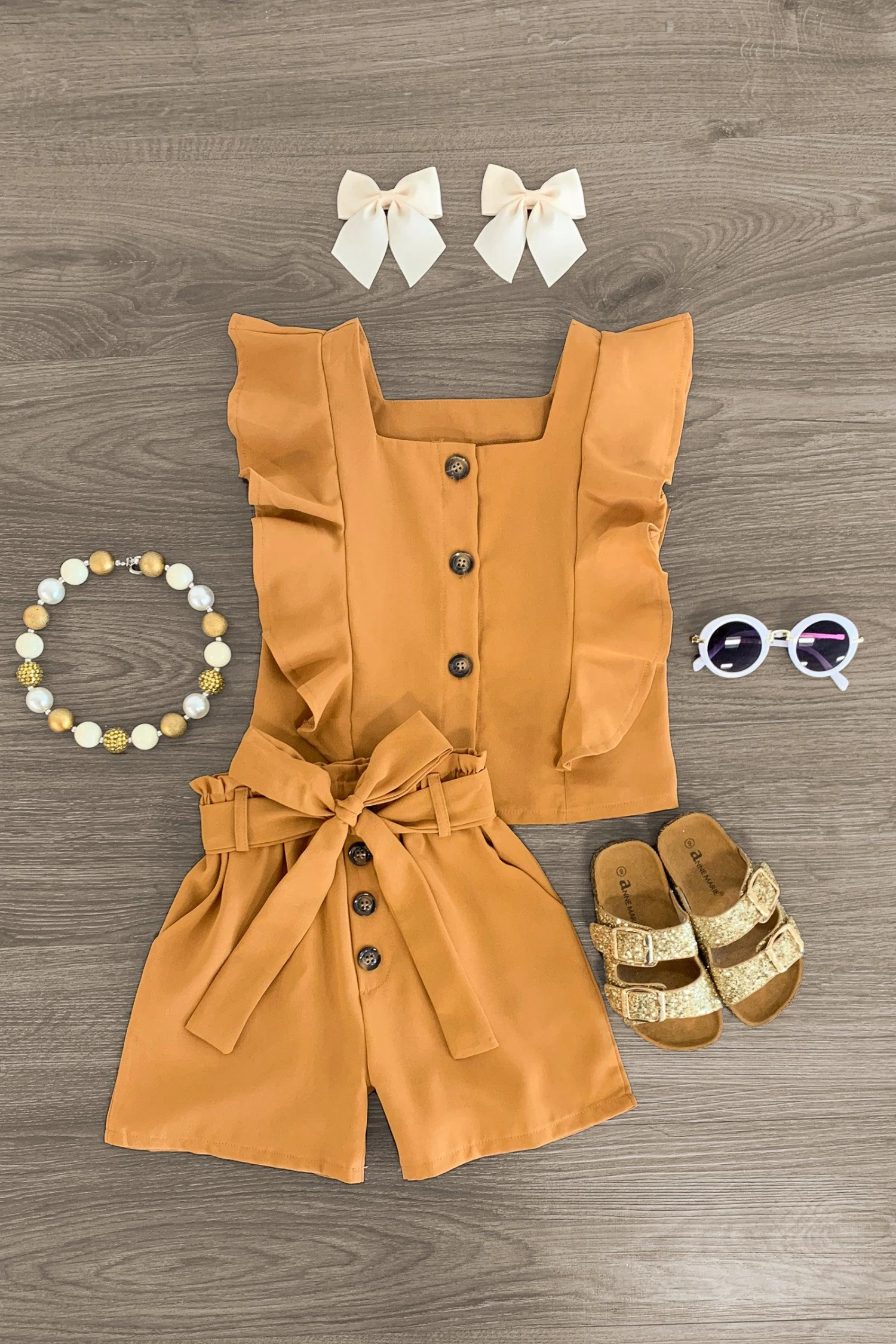From days with friends and family to playing outside, your little one will look cool and comfy in our Brown Ruffle Button Short Set. This two-piece set includes a ruffle top and a pair of matching pull-on shorts with decorative buttons. These pieces can be worn as a set, or they can be mixed and matched with other pieces for more adorable ensembles. Complete the look with a pair of SIP sandals and our fun bows for the perfect warm weather outfit!