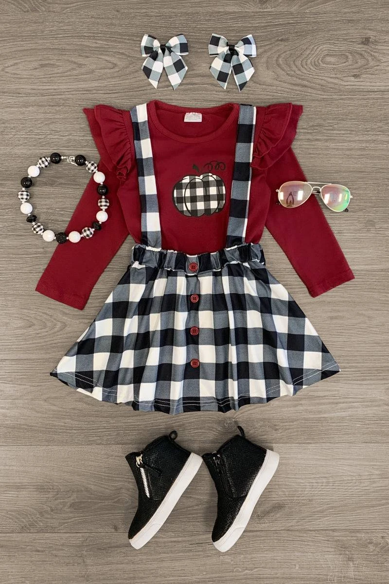 Add sweet fluttery style to her look with this Burgundy Plaid Pumpkin Suspender Skirt Set. This girls’ set is styled with a simple crewneck and long sleeves, making it a staple addition to her everyday wear. Paired with a matching plaid suspender skirt, it adds a playful twist to her look. The breathable fabric makes for comfy wear, while the pull-on style allows for simple dressing. She can pair this dress with booties or a matching bow for the perfect look!