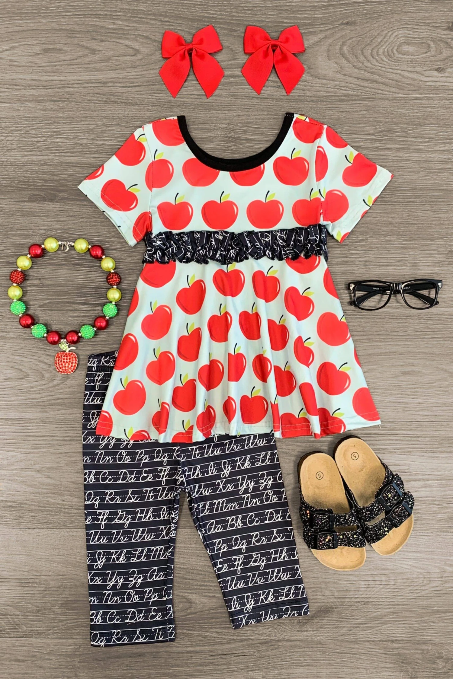 Add sweet fluttery style to her look with this Chalkboard Alphabet & Apples Capri Set. This girls’ set is styled with a sweet apple print top making it a staple addition to her everyday wear. The top is paired with matching chalkboard alphabet capris with a stretchy waistband that provides a secure fit. She can pair this set with sandals or a matching necklace for the perfect school look!