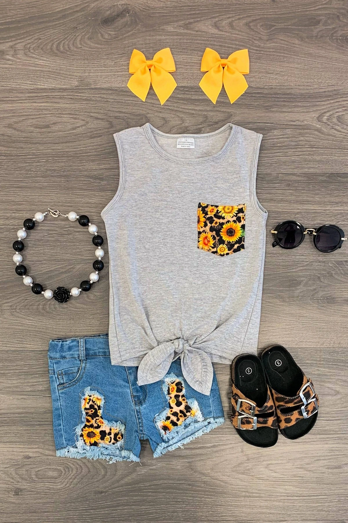 Bring on the warmer weather with this Cheetah Sunflower Tie Top Denim Short Set. This tank top with tie front looks adorable paired with the matching distressed denim shorts. The stretch waistband helps with comfort and fit and can be great for on the go. The top and shorts can be worn as a set and paired with our sandals or keep it laid back with a pair of sunglasses, she’ll shine bright in this kids ensemble.