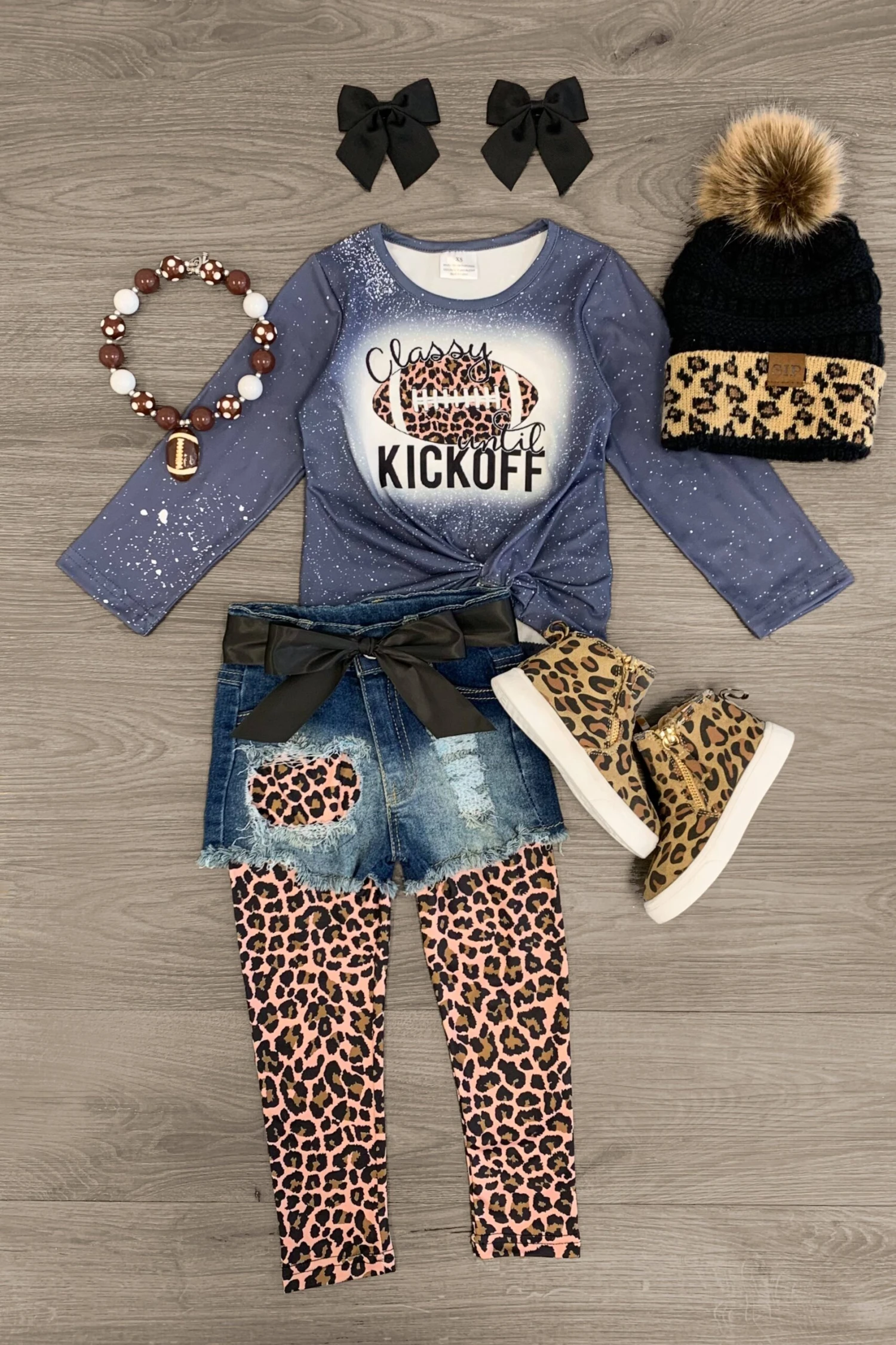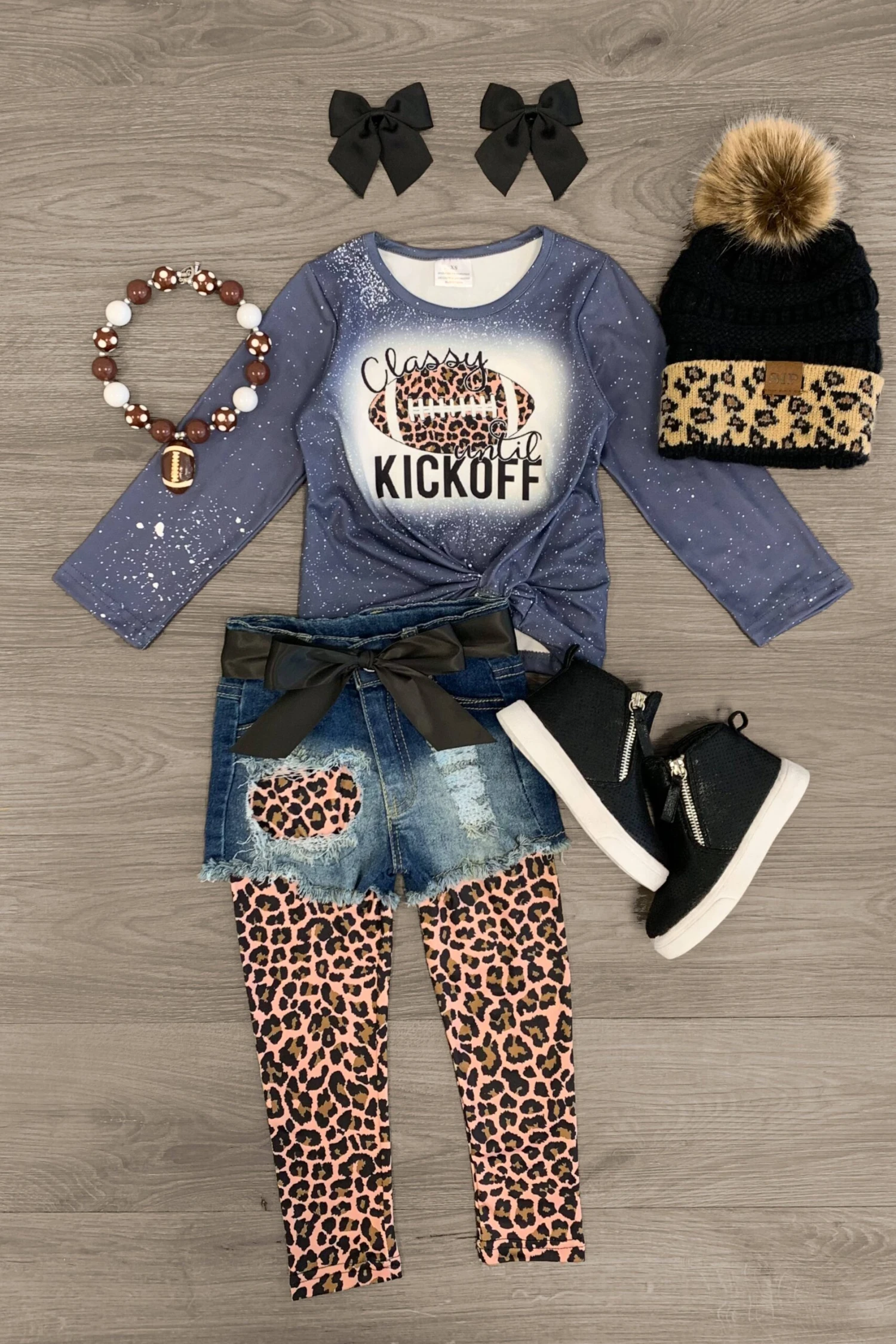 Be the cutest girl around with this “Classy Until Kickoff” Leopard Legging & Short Set. This girls’ set is styled with a simple long sleeve top with a cute football design on the front making it a staple addition all season long. This top is paired with matching distressed denim shorts and leopard print leggings to match. The ultra soft fabric makes for comfy all day wear. She can pair this outfit with booties or a matching bow for the perfect look!