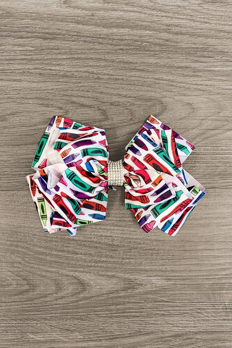 Add cute detail to her everyday hairstyles with this Colorful Crayons Bow. This adorable bow features a crayon print and makes a versatile piece in her hair accessories, and is easy to match with any outfit. The girly bow comes attached to an alligator clip that makes it easy to clip into any hairstyle for easy styling. She can wear it with a range of hairstyles, from pigtails to ponytails, for sweet and simple accessorizing.