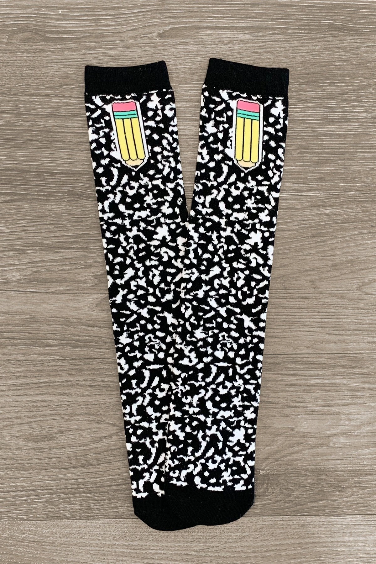 Whether she’s exploring the outdoors with friends or relaxing at home, your girl will be ready for another exciting day back at school in our Composition Notebook Knee High Socks. Made from a durable fabric with added spandex, these girls’ socks provide her feet cozy and stretchy comfort, and they’re designed with banded cuffs that help keep them in place. Pair these socks with our clear rubber boots for the perfect look!