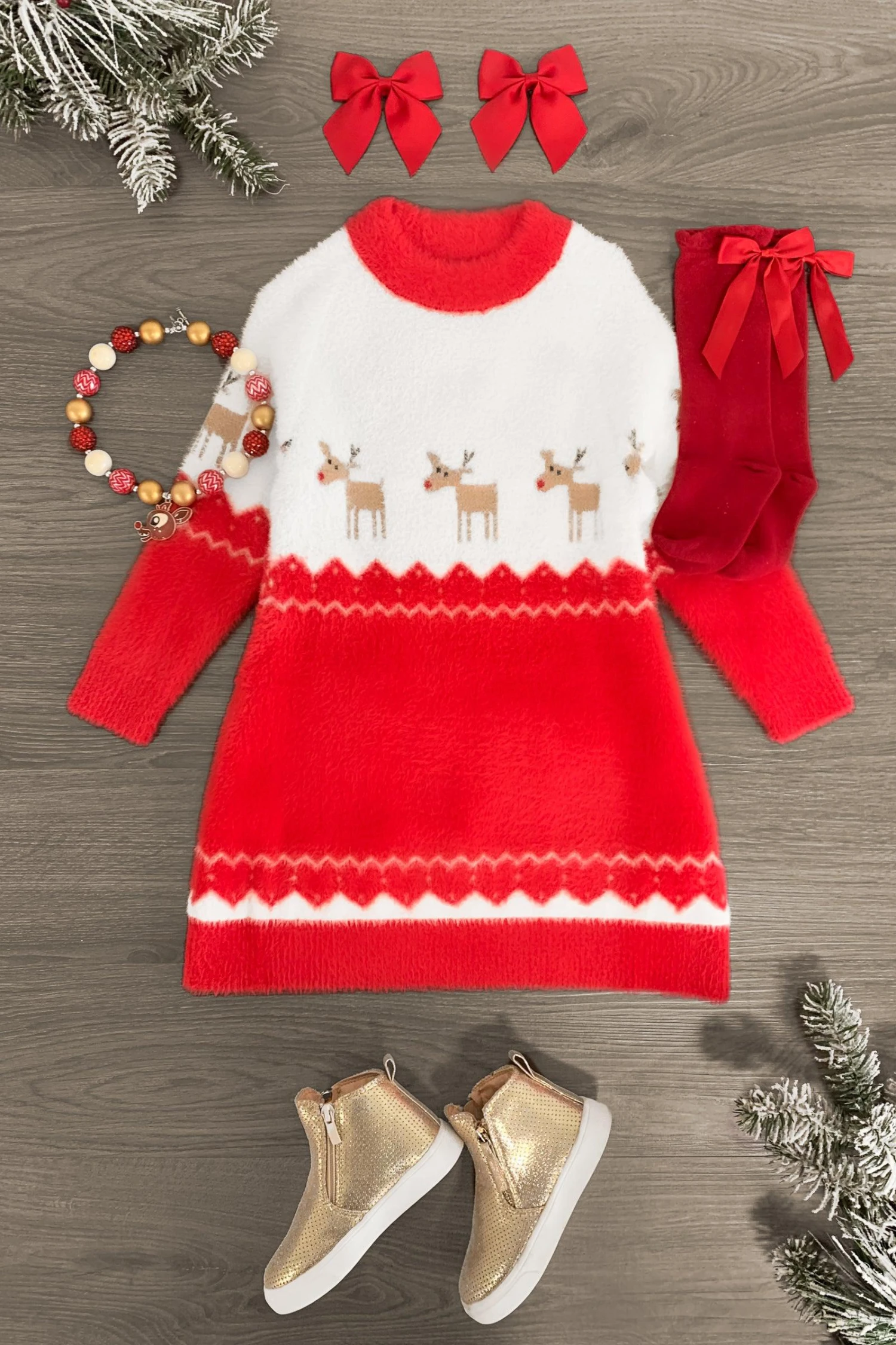 - Dress features a red & white reindeer design