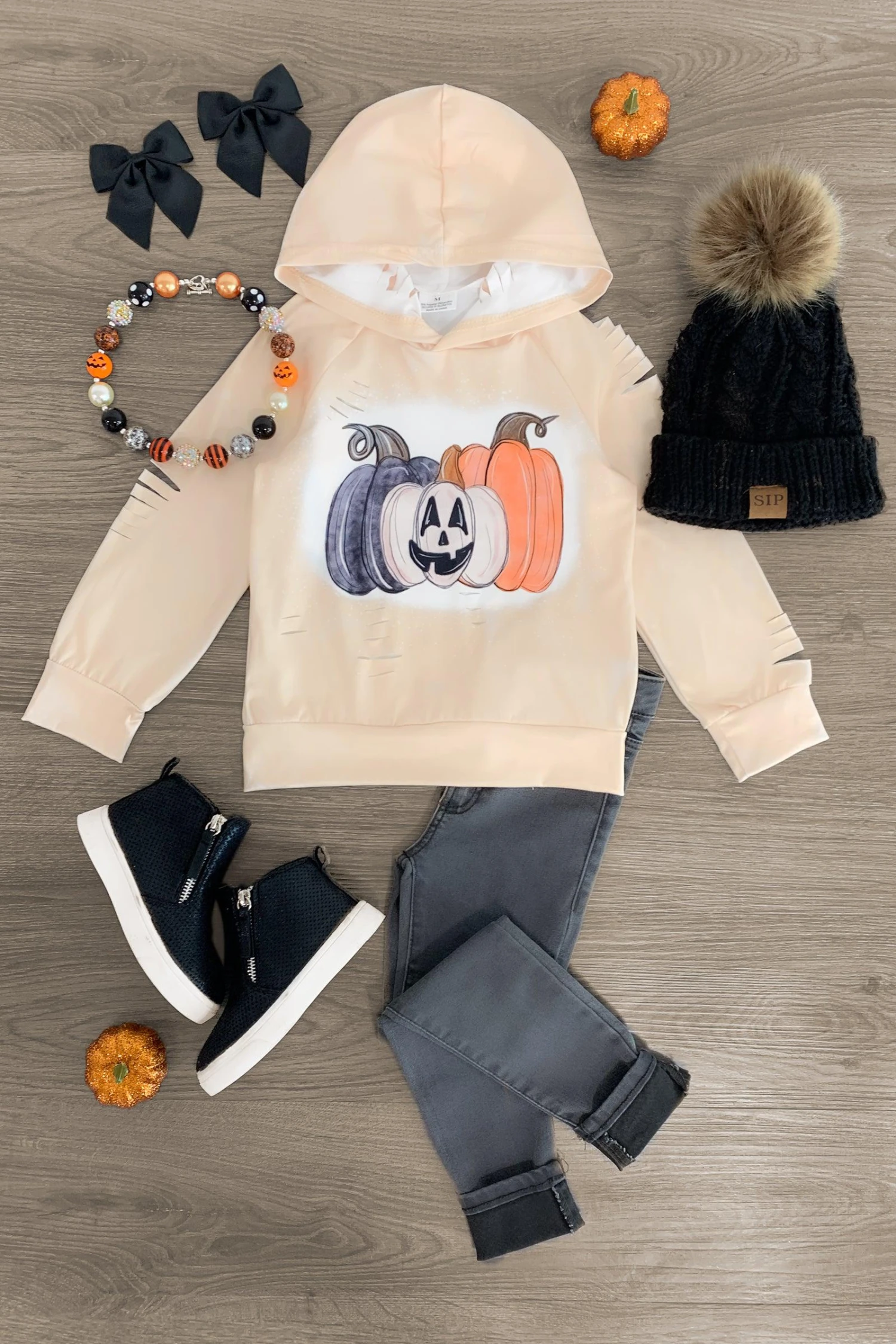 Your gal will love the comfort and cool style this Cream Pumpkin Hooded Top brings to her Fall wardrobe. Made from soft & breathable fabric, this girls’ hoodie feels cozy against her skin, while the long sleeves offer a comfy fit. Featuring a cream design with distressed accents and a pumpkin design on the front, she can pair this top with our matching bows & booties for the perfect look!