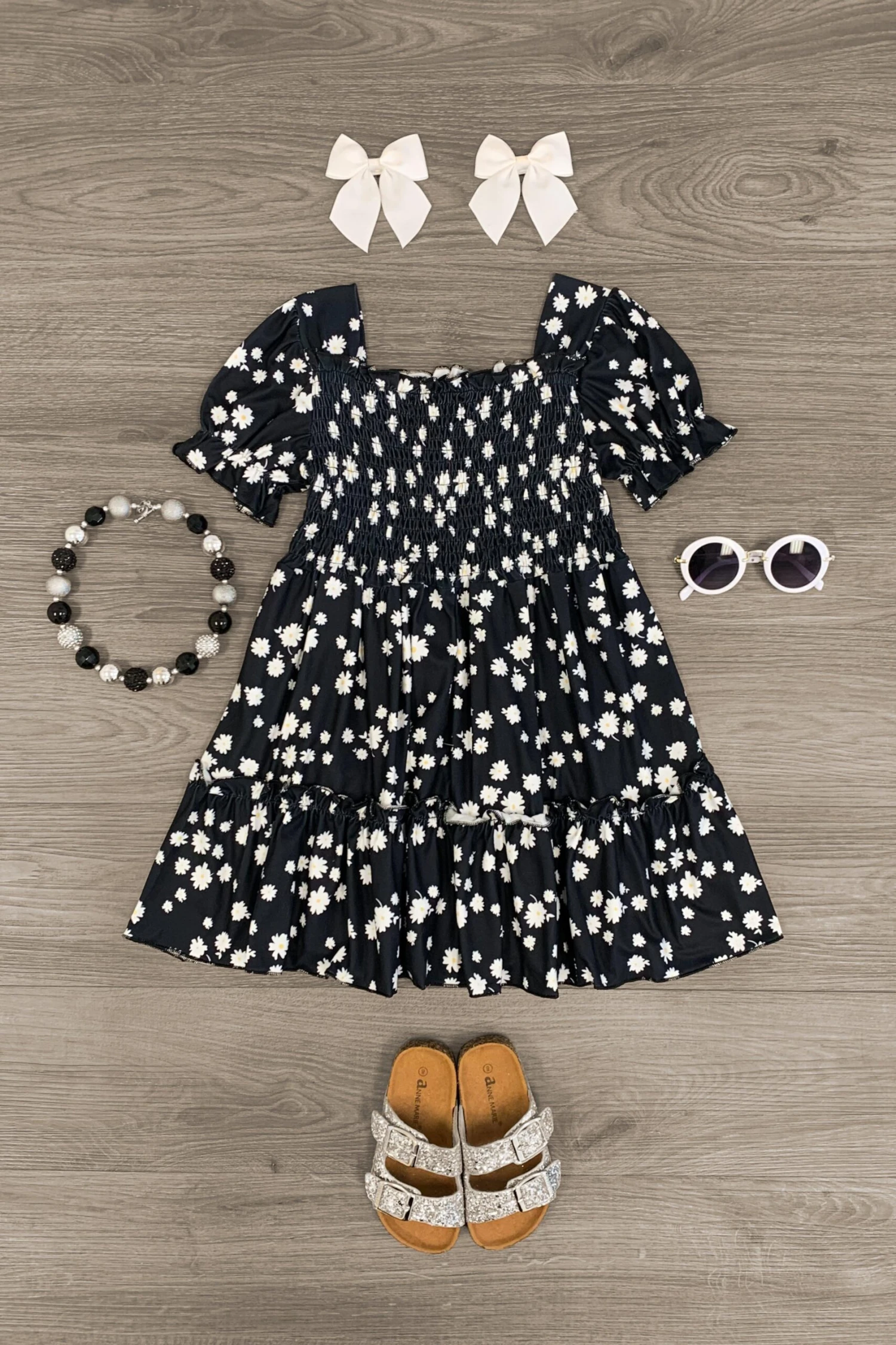 Add sweet fluttery style to her look with this Daisy Ruffle Dress. This girls’ dress is styled with a smocked bodice and puffy sleeves, making it a staple addition to her springtime wear. Featuring a ruffled design with a cute daisy pattern, it adds a playful twist to her look. The breathable fabric makes for cool and comfy wear, while the stretchy bodice allows for simple dressing. She can pair this dress with a matching bow and sandals for the perfect look!