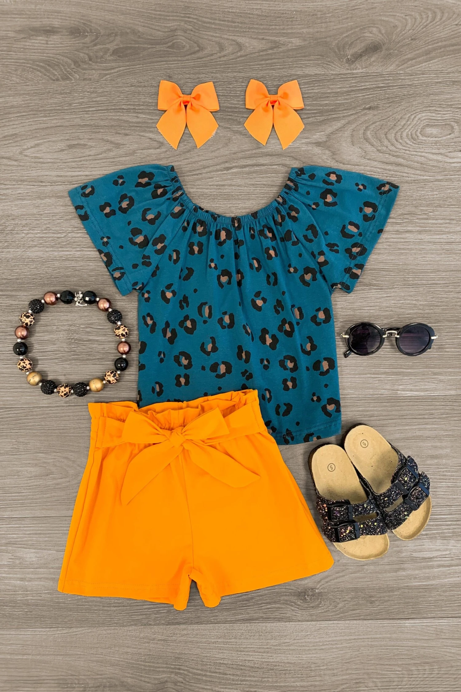 Bring on the warmer weather with this Dark Teal Cheetah Tie Short Set for girls. This top looks adorable paired with the mustard yellow shorts. The stretchy waistband helps comfort and fit and can be great for on the go, while the tie waist keeps your little one looking like a dream. The top and shorts can be worn as a set and paired with our SIP bows or keep it laid back with a pair of sunglasses, she’ll shine bright in this kids ensemble.