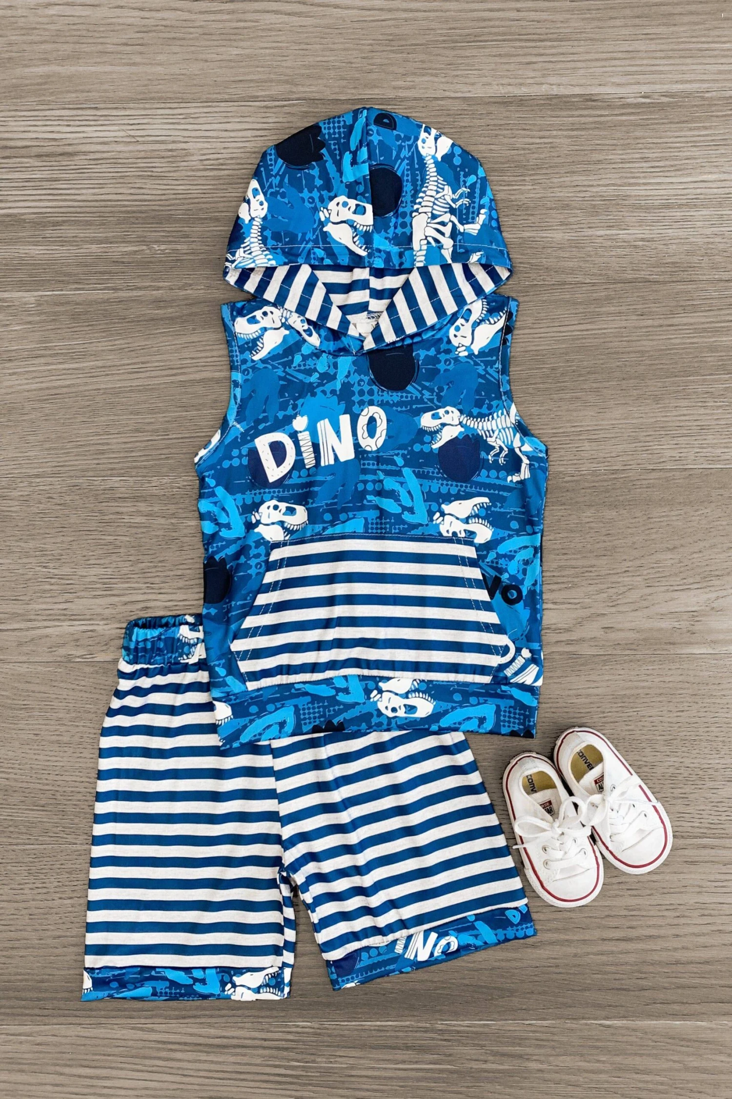 From days with friends and family to playing in the sand, your little guy will look cool and comfy in our “Dino” Striped Sleeveless Hoodie Short Set. Featuring an easy pull-on design, this two-piece outfit set includes a hooded tank with a pouch pocket and a pair of matching striped shorts. These pieces can be worn together as a set or they can be mixed and matched with other pieces for versatile and comfy ensembles.