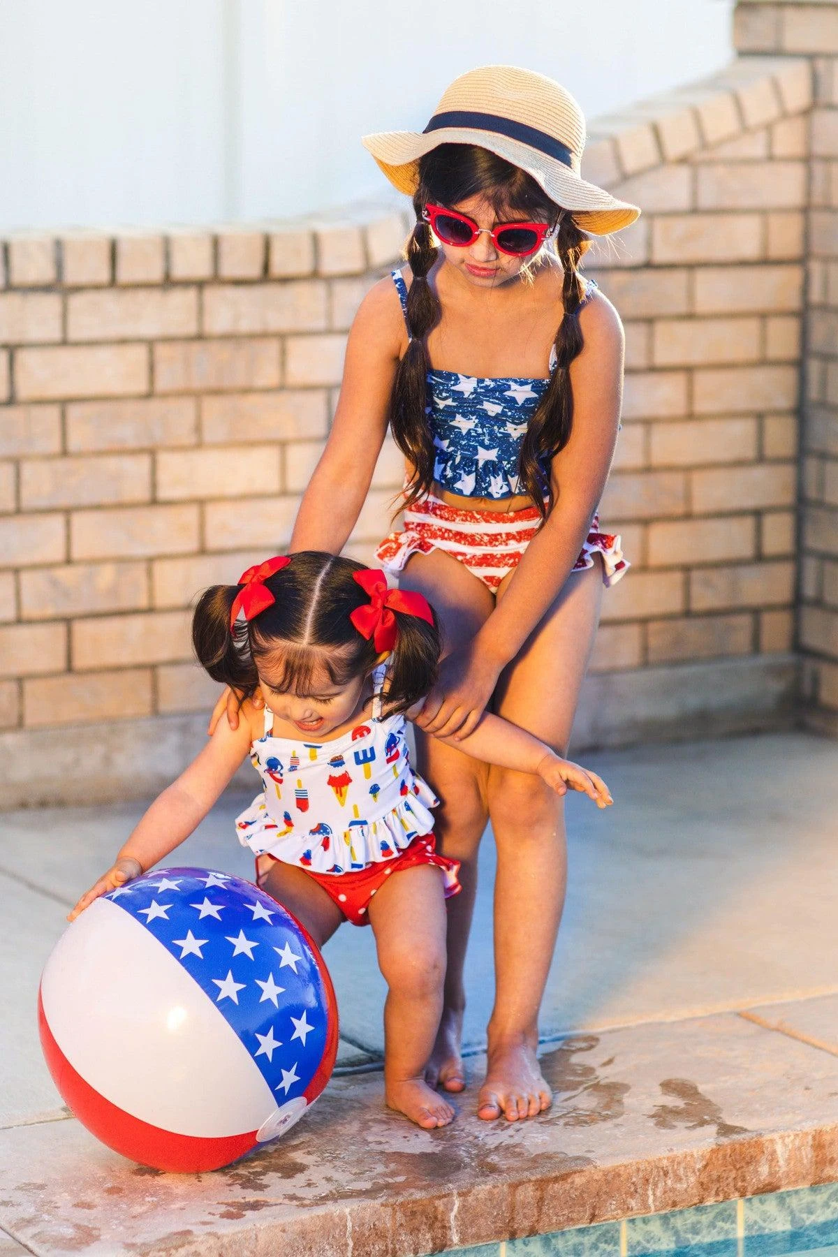 Our Distressed Flag High-Waisted Swimsuit Set will be your girl’s fave go-to for pool parties with friends or a tropical vacation with the family. An eye-catching American flag design brightens up this two-piece swim set, making it an extra playful choice for her next sunny day. The swim top features a bandeau style with ruffle detail for a pop of fluttery charm, while the matching bikini bottoms have a high-waist design for a sweet touch. Pair this swimsuit with sunglasses & sandals for the perfect beachy look!