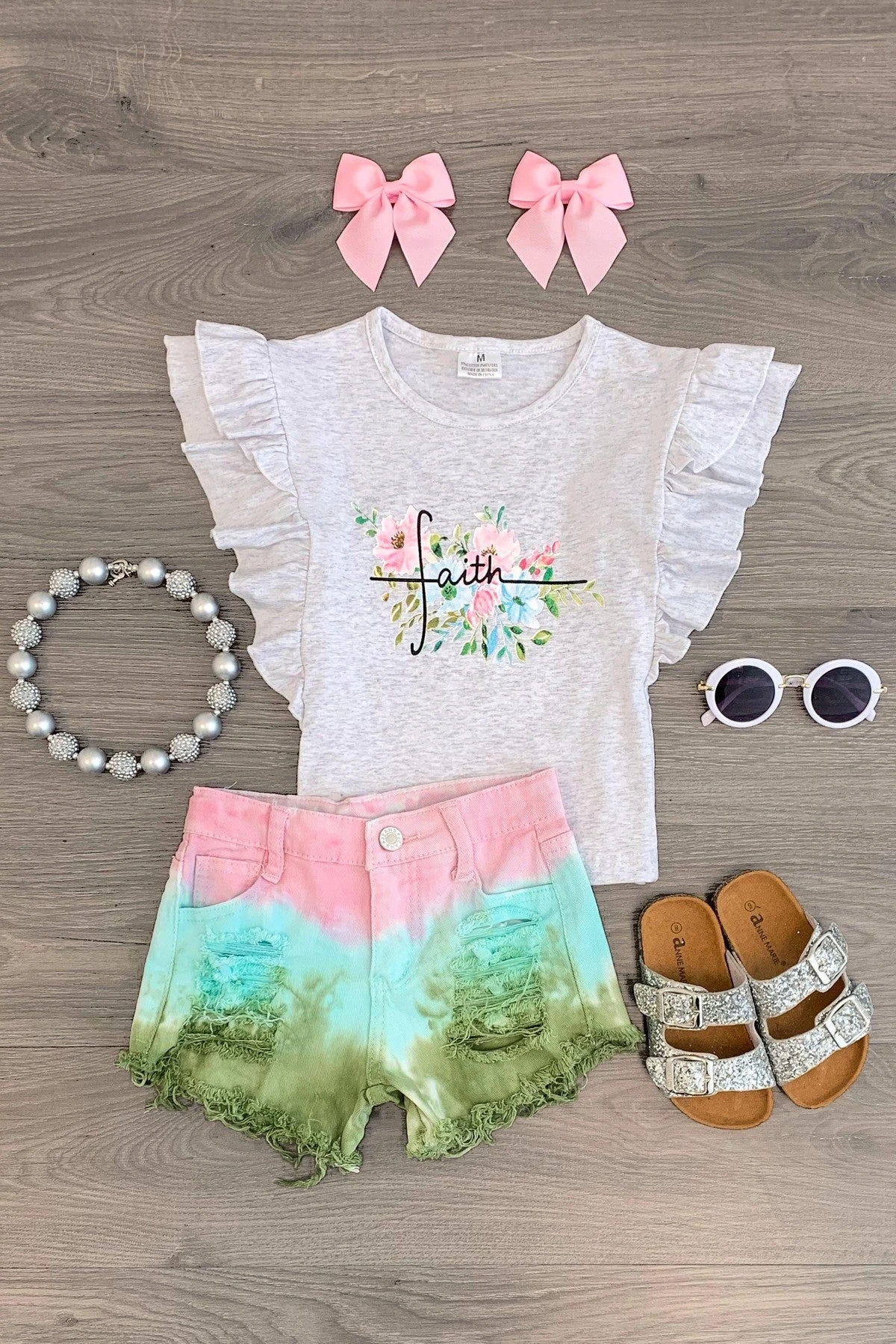 Bring on the warmer weather with this “Faith” Floral Tie Dye Denim Short Set for girls. This short sleeve top looks adorable paired with distressed ombré denim shorts. The adjustable waistband helps comfort and fit and can be great for on the go. The top and shorts can be worn as a set and paired with our matching sequin bows or keep it laid back with a pair of sunglasses, she’ll shine bright in this kids ensemble.