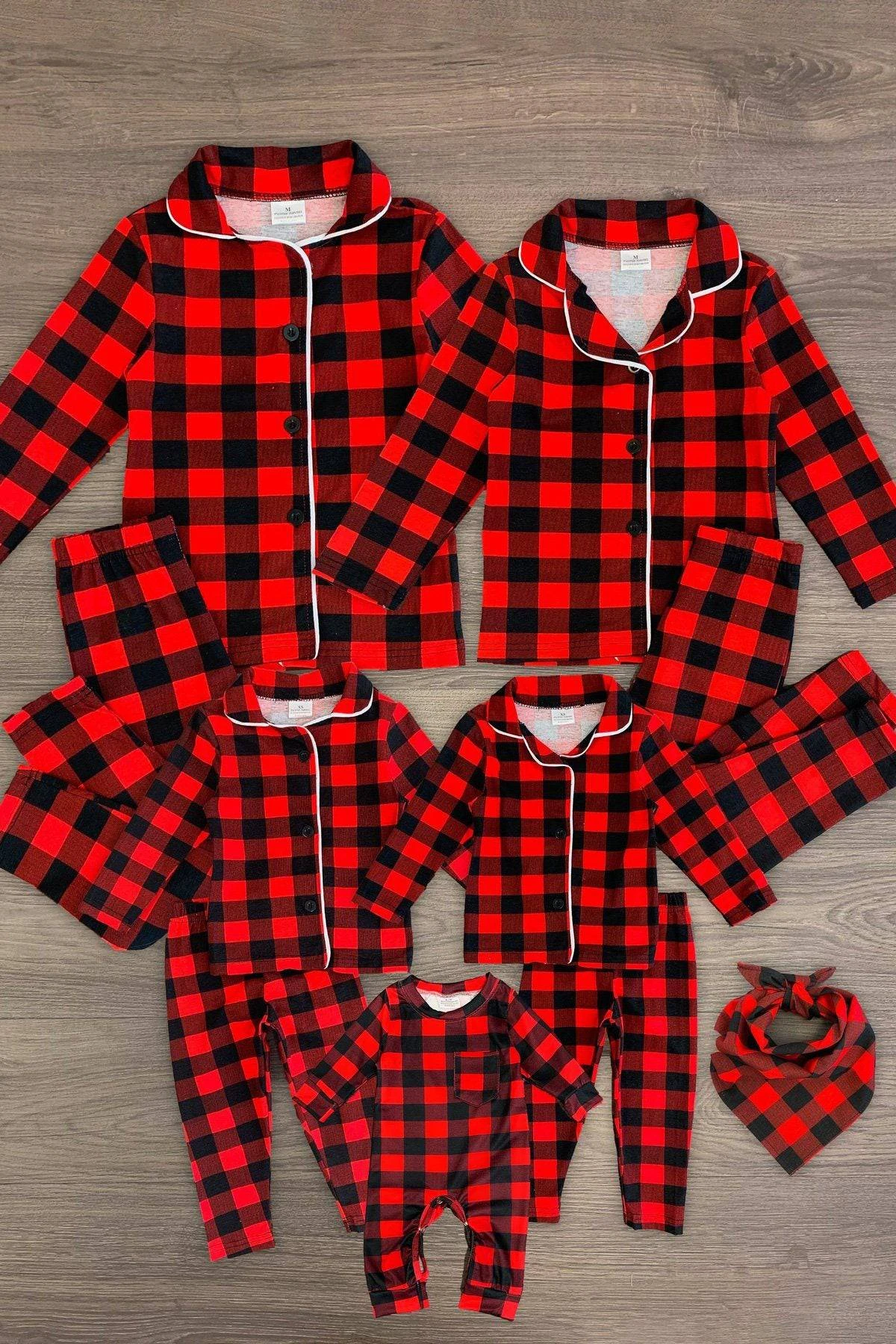 These Family & Pet Buffalo Plaid Pajama Sets in red features long sleeves and a fun plaid print. Each set comes with a collar button up top & matching bottoms. This pajama set is perfect for Holiday photo shoots, or cozy movie nights with the family.