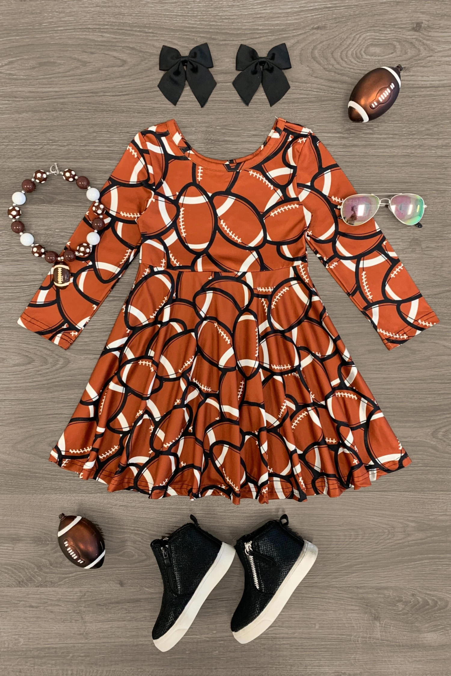 Add sweet fluttery style to her look with this Football Long Sleeve Dress. This girls’ dress is styled with an allover football print. This long sleeve design makes it a staple addition to her everyday wear. The breathable fabric makes for cool and comfy wear, while the pull-on style allows for simple dressing. Pair this dress with a matching SIP bow or a pair of booties for the perfect look!