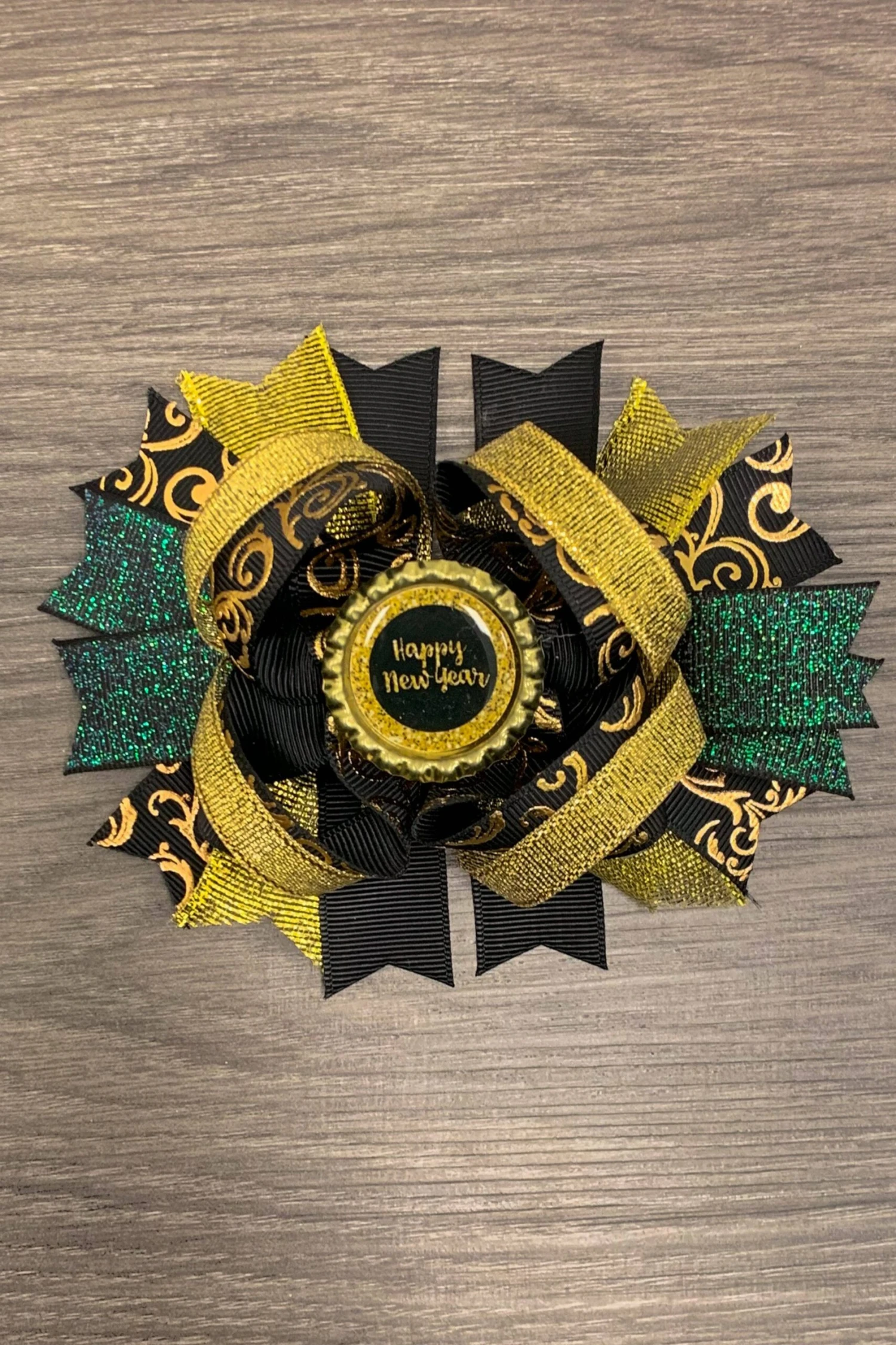 Get your locks ready for the holiday celebrations with this Gold & Black “Happy New Year” Bow. The clip is easy to add to your hair, whether you’re holding a few strands back from your face or decorating a ponytail. This hair accessory features black, green & gold ribbon and a “Happy New Year” design in the center. This bow is perfect to get in the holiday spirit!