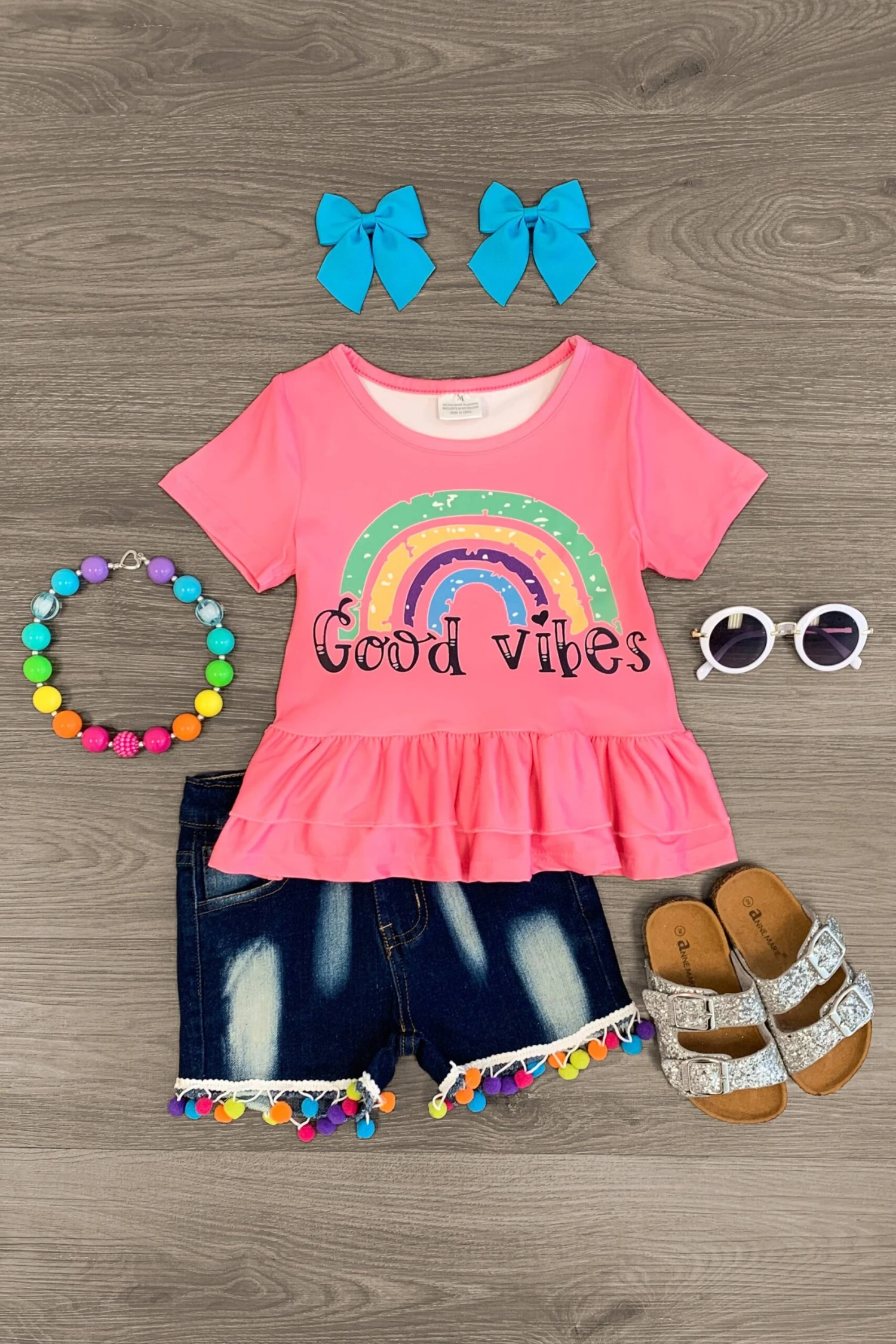Bring on the warmer months with this “Good Vibes” Pink Ruffle Pom Pom Short Set for girls. This set features a pink short sleeve top with a ruffled hem. This top looks adorable paired with the matching denim shorts. The stretchy waistband helps comfort and fit and can be great for on the go, while the rainbow pom-pom details adds the perfect pop to her look. The top and shorts can be worn as a set and paired with our comfy sandals or keep it laid back with a pair of sunglasses, she’ll shine bright in this kids ensemble.