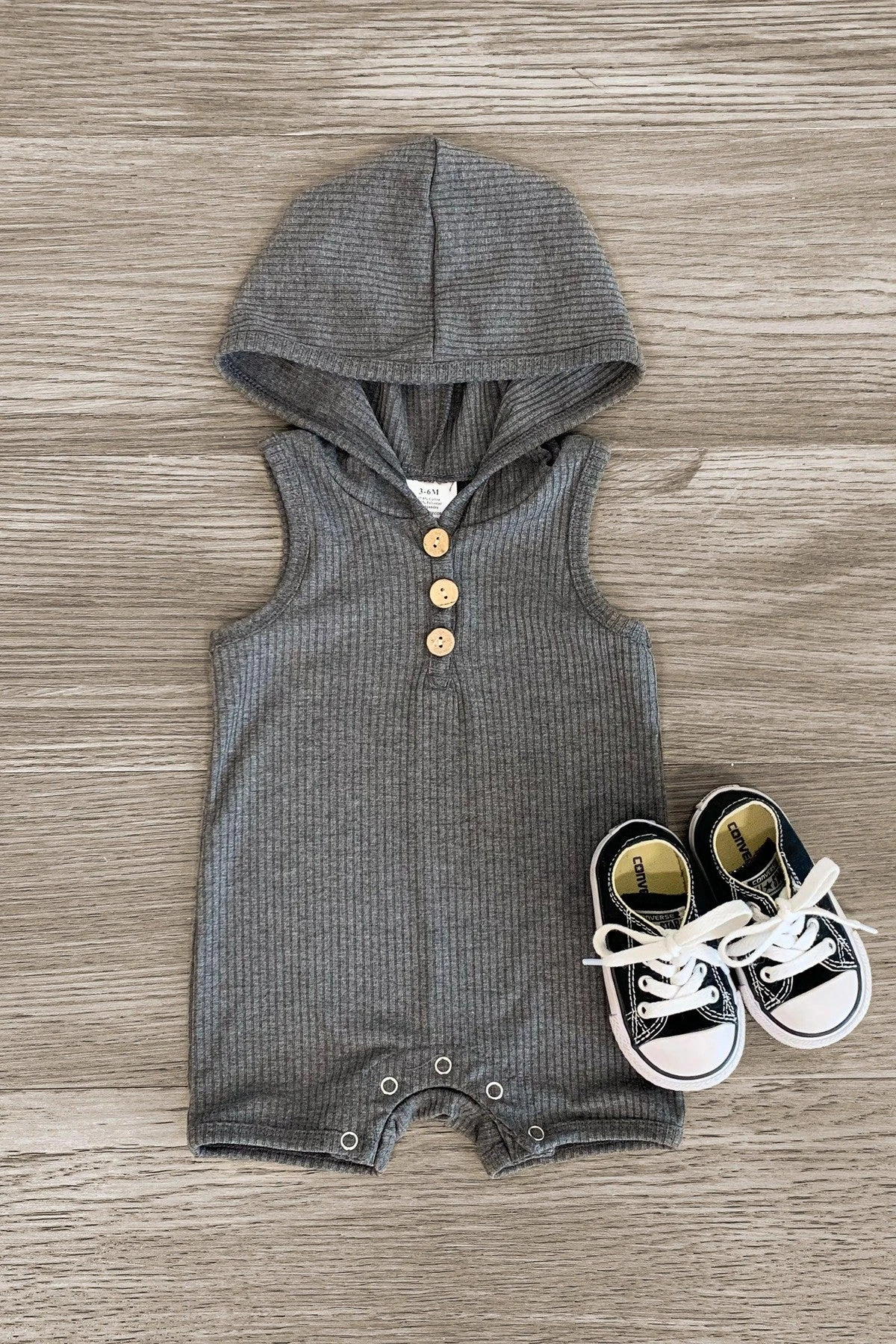 Dress up your little one for the day in this Gray Hooded Baby Romper. The romper is made from soft & stretchy fabric that makes a comfortable one-piece for warm-weather wear. It features an allover gray ribbed design with functional buttons and a hood. The snap fastenings on the crotch allow for easy dressing and changing. Check out our boys’ collection for more rompers like this one!