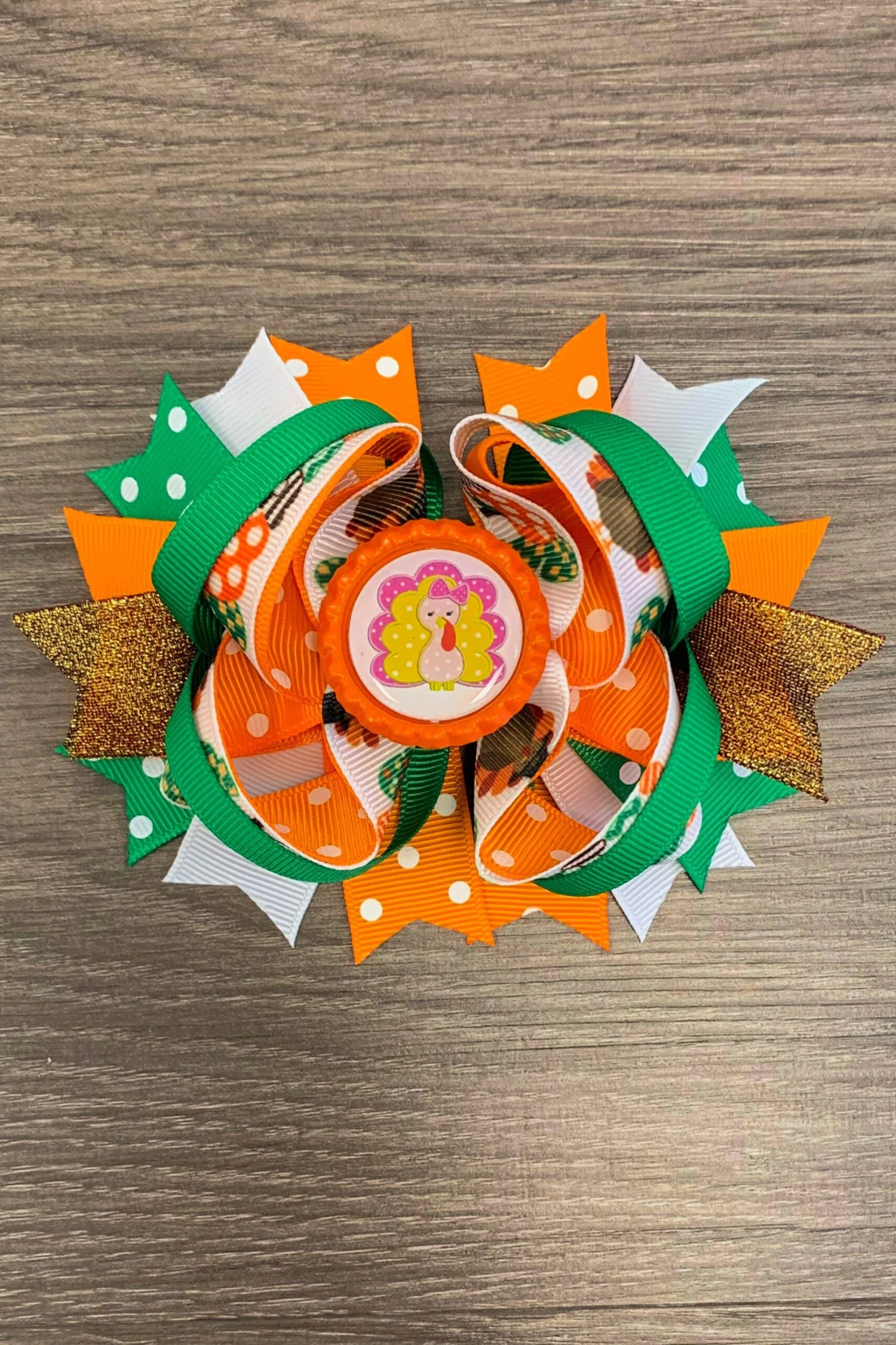 Get your locks ready for the Thanksgiving celebrations with this “Gobble” Turkey Bow. The clip is easy to add to your hair, whether you’re holding a few strands back from your face or decorating a ponytail. This turkey hair accessory features a circle of ribbons providing the perfect backdrop for the turkey button in the middle. This bow is perfect to get in the festive spirit.