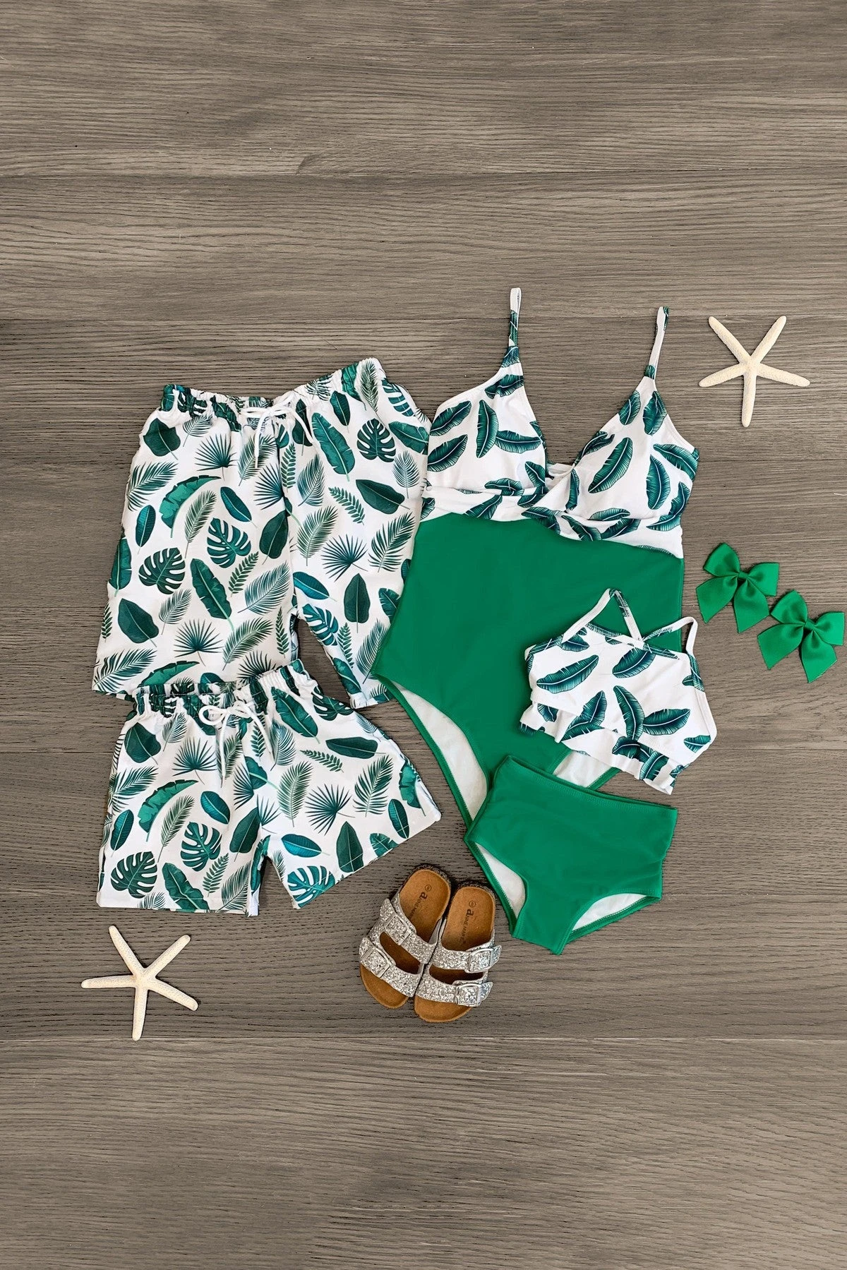 Match with the family in sweet style in these Green Tropical Family Swimsuits. Mom & girl swimsuits feature a fun green & white palm design. Dad & boy swim trunks feature a standard swim trunk design and a matching print. These swimsuits are perfect for your next family beach vacation. Check out our swimsuit collection for more beach & pool-ready looks like this one!