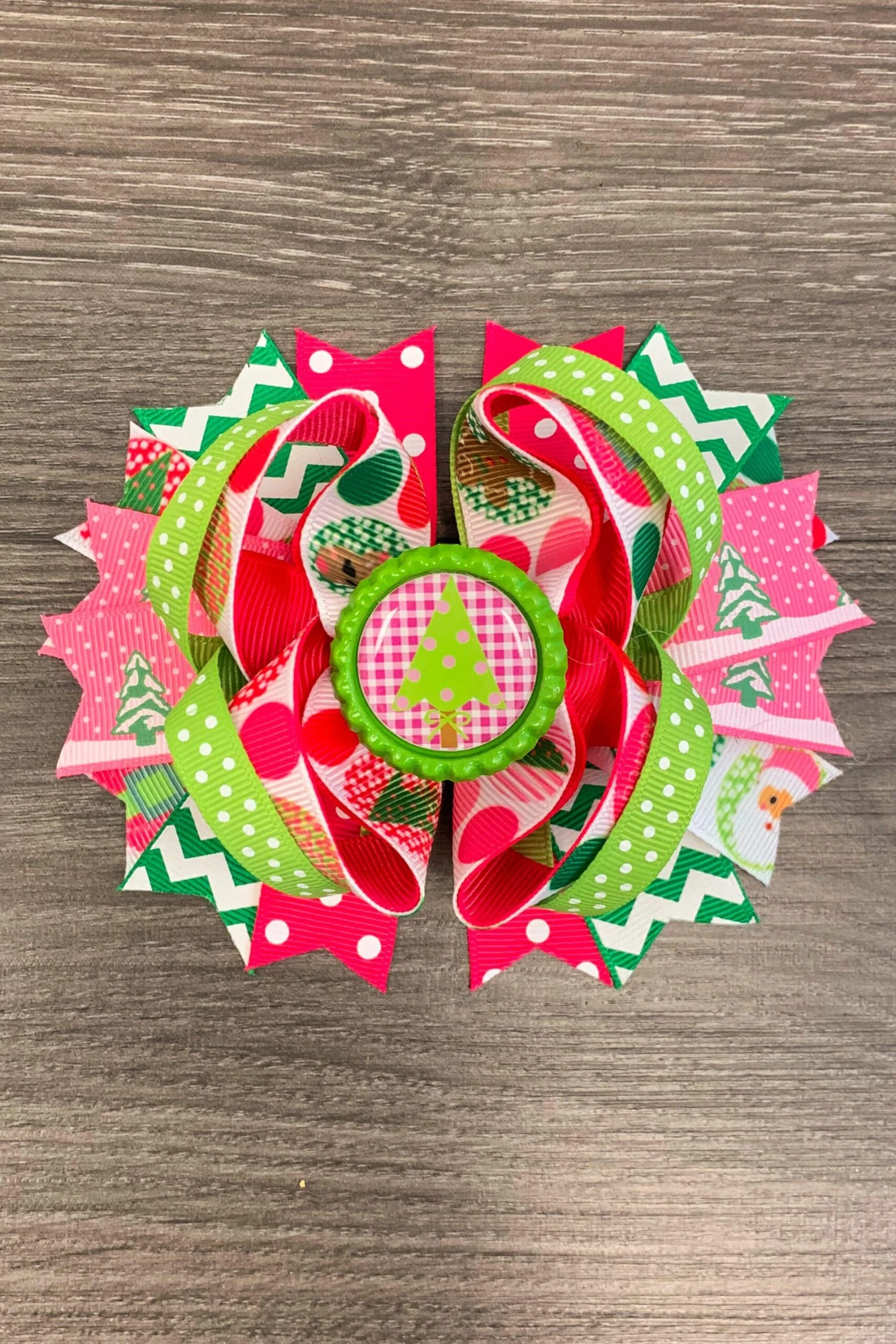 Get your locks ready for the holiday celebrations with this “Happy Christmas” Bow. The clip is easy to add to your hair, whether you’re holding a few strands back from your face or decorating a ponytail. This hair accessory features an array of polka dot, chevron, and Christmas patterned ribbons! These create the perfect backdrop for the cute little Christmas tree button! This bow is perfect to get in the holiday spirit!