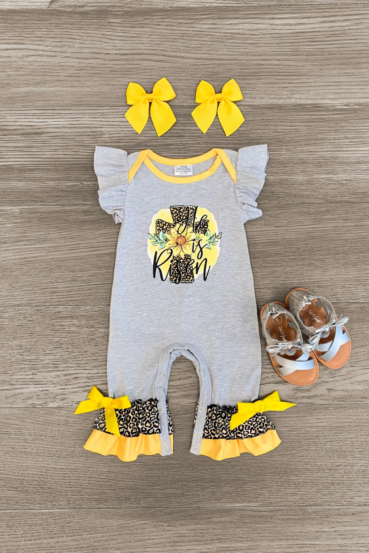 Dress up your little girl for sunny days in this “He Is Risen” Gray & Yellow Romper Romper. This ruffle sleeve onesie is made from soft & stretchy fabric, making it a comfortable one-piece for warm-weather wear. It features heather gray design with yellow & cheetah ruffle details. The snap fastenings on the crotch allow for easy dressing and changing. Pair this onesie with a couple SIP bows for the perfect Fall look.