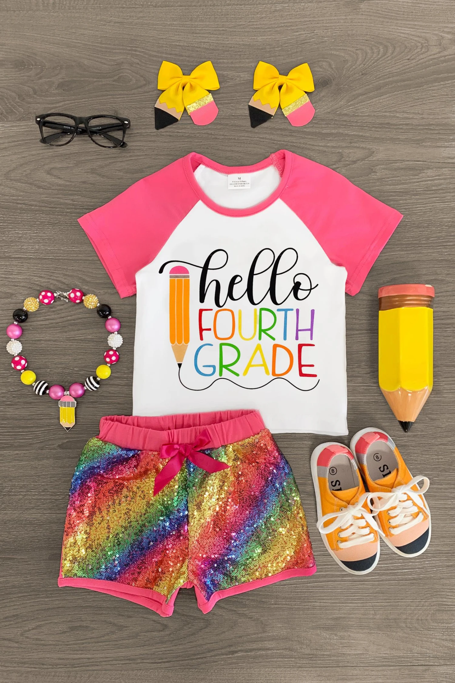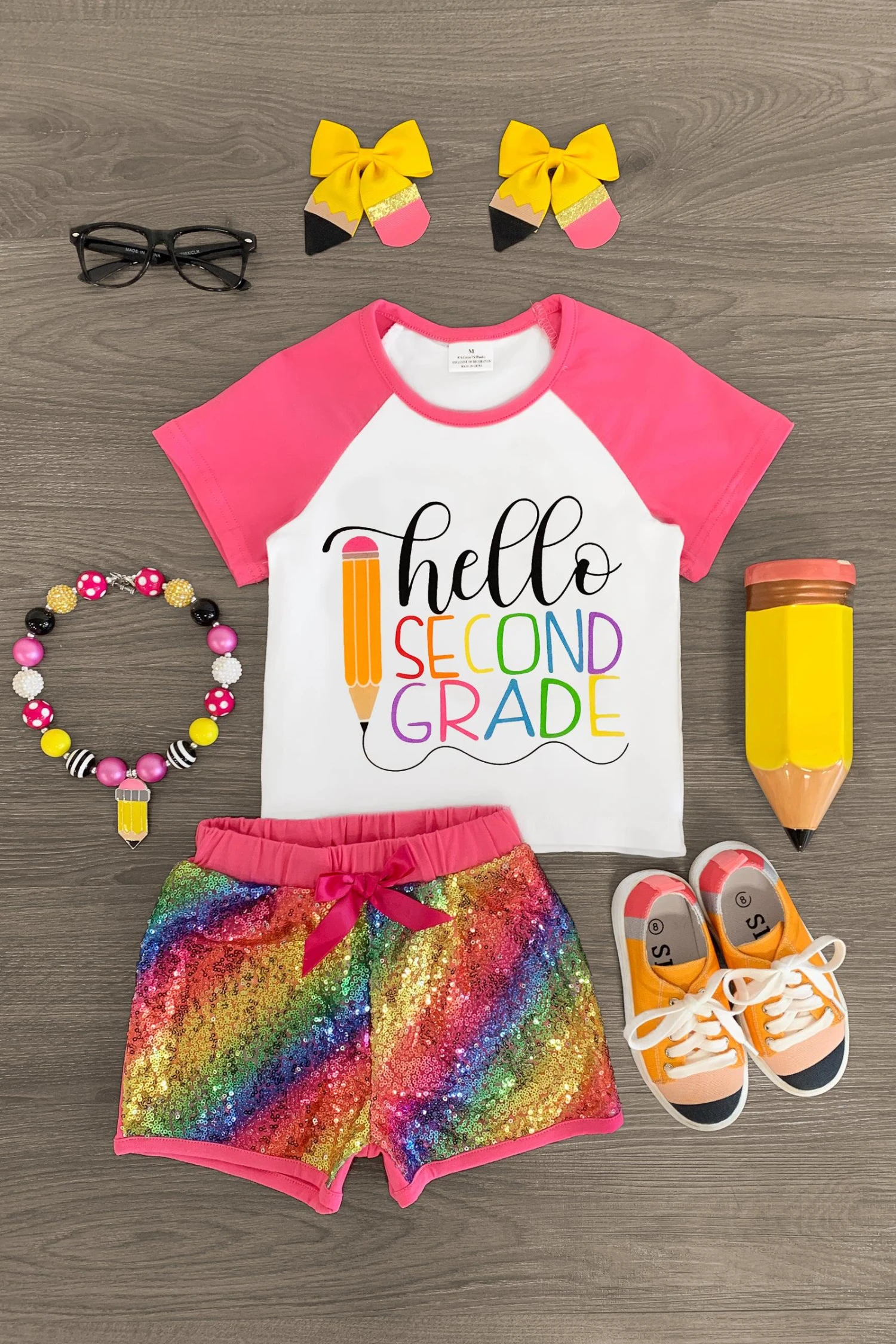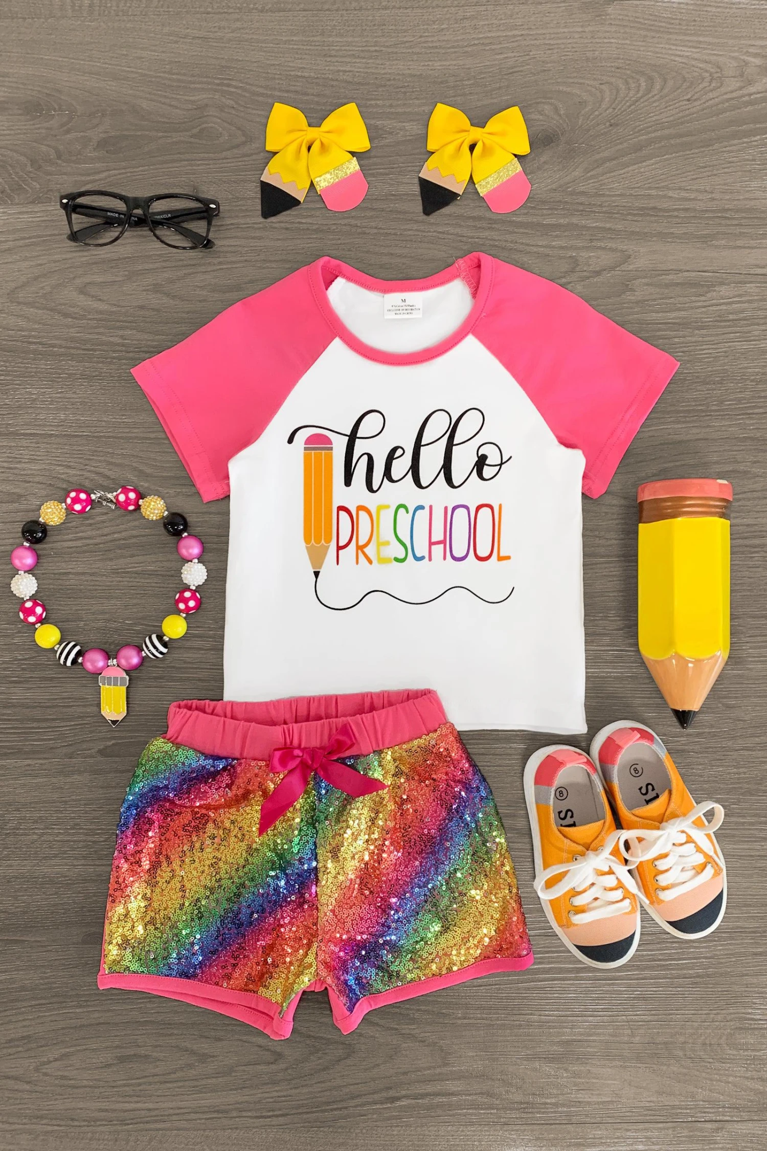 Your sassy little one will look so cute at school in this “Hello Preschool – 4th Grade” Rainbow Sequin Short Set for girls. The top features a cute back to school design on the front and is paired with matching sequin shorts. The stretch waistband helps comfort and fit and can be great for on the go, while the sequins add a fun touch to her look. The top and shorts can be worn as a set and paired with our matching bows or keep it laid back with a pair of sandals, she’ll shine bright in this kids ensemble.