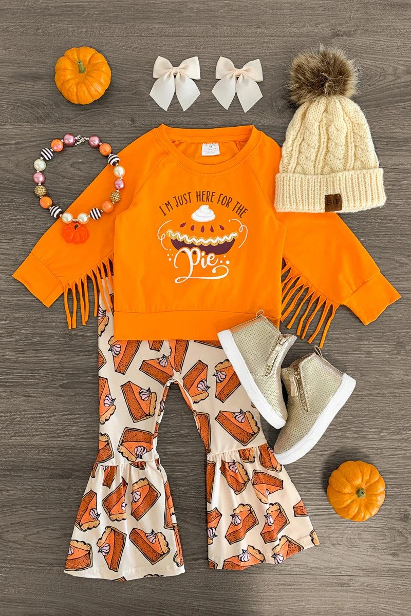 Get reads to gobble down some Thanksgiving pie with this “I’m Just Here For The Pie” Bell Bottom Set! This girls’ set is styled with a fringe long sleeve top that features a fun pumpkin pie design & cute saying on the front, making it a staple addition to her Fall wardrobe. The top is paired with matching pie print bell bottoms. The stretch waistband provides a secure fit that allows for all day comfort. She can pair this set with booties or a necklace for the perfect look!
