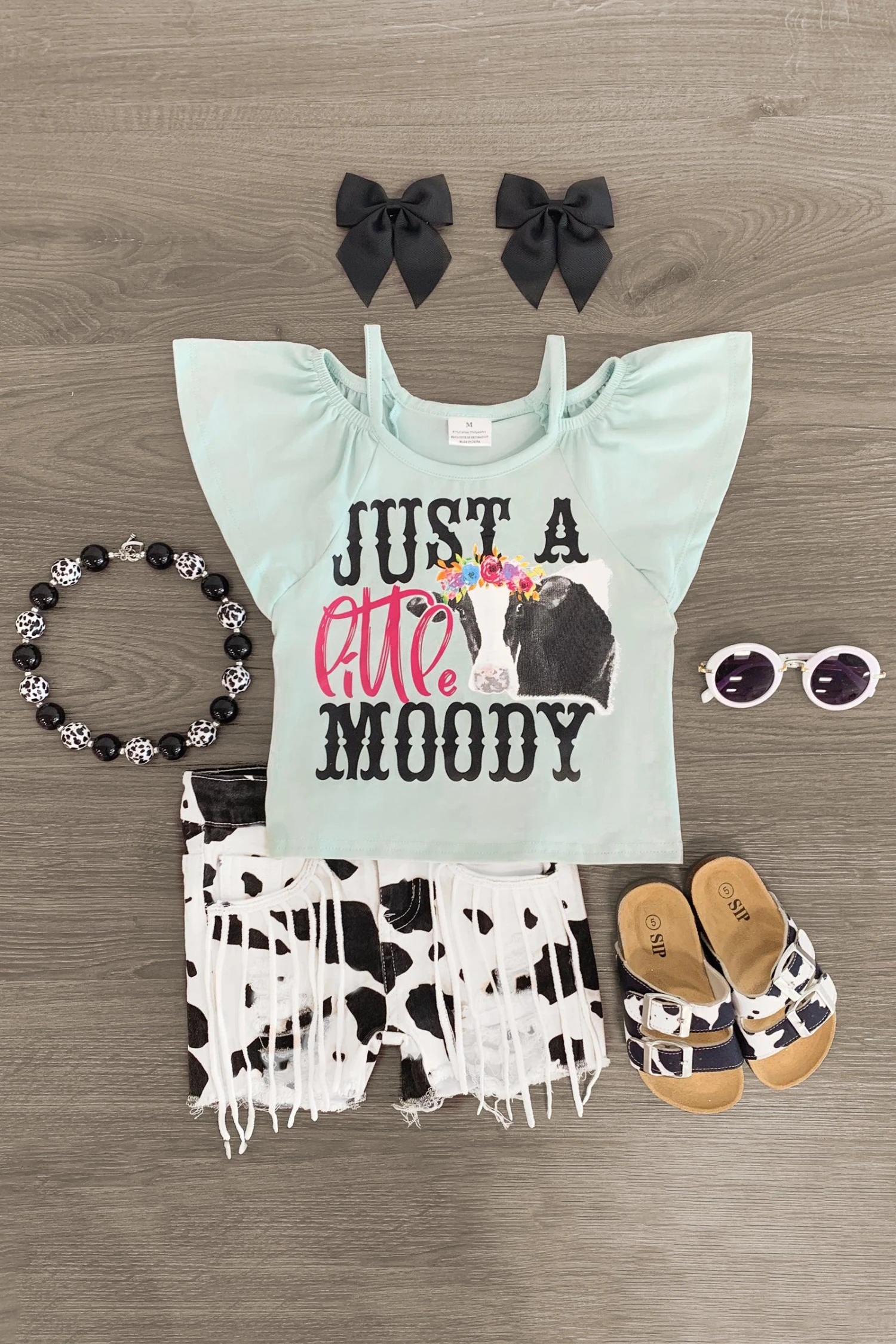 Bring on the warmer weather with this “Just A Little Moody” Cow Denim Short Set for girls. The mint top features a fun design on the front and looks adorable paired with the cow print denim shorts. The adjustable waistband helps comfort and fit and can be great for on the go, while the fringe details add a fun pop to her look. The top and shorts can be worn as a set and paired with our SIP bows or keep it laid back with a pair of sunglasses, she’ll shine bright in this kids ensemble.