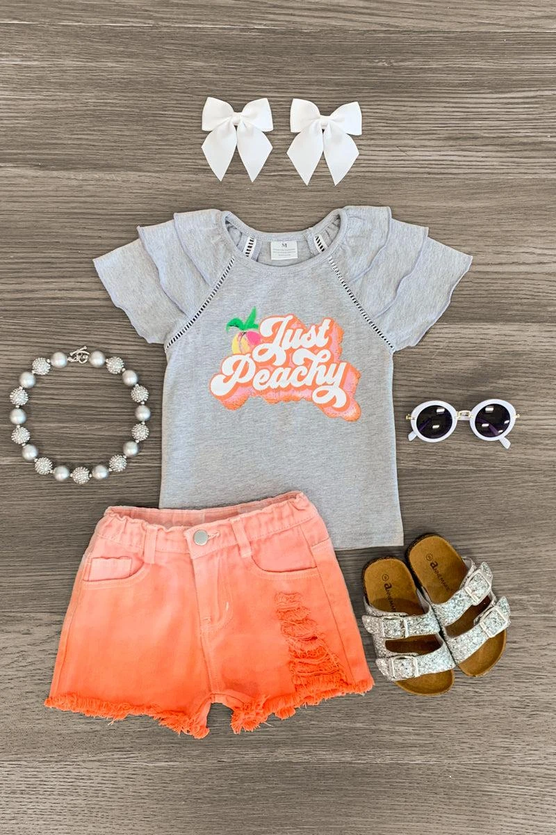 Bring on the warmer weather with this “Just Peachy” Ombre Denim Short Set for girls. The ruffle sleeve top features a fun design on the front and looks adorable paired with the matching orange ombre denim shorts. The adjustable waistband helps comfort and fit and can be great for on the go, while the distressing adds a fun touch to her look. The set can be paired with our cute sandals and a pair of sunglasses for the perfect look!