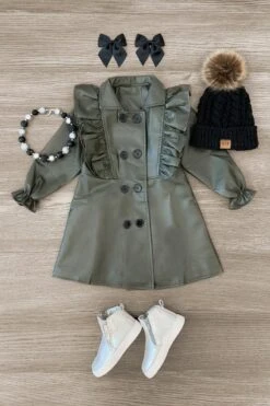 Your gal will love the comfort and cool style this Leather Ruffle Trench Coat brings to her cool weather wardrobe. Made from soft faux leather material, this girls’ jacket will keep her warm, while the ruffle detail and peplum design offer a feminine fit. Coat features functional buttons for pretty and simple dressing. Pair this jacket with our matching bows or booties for the perfect look!