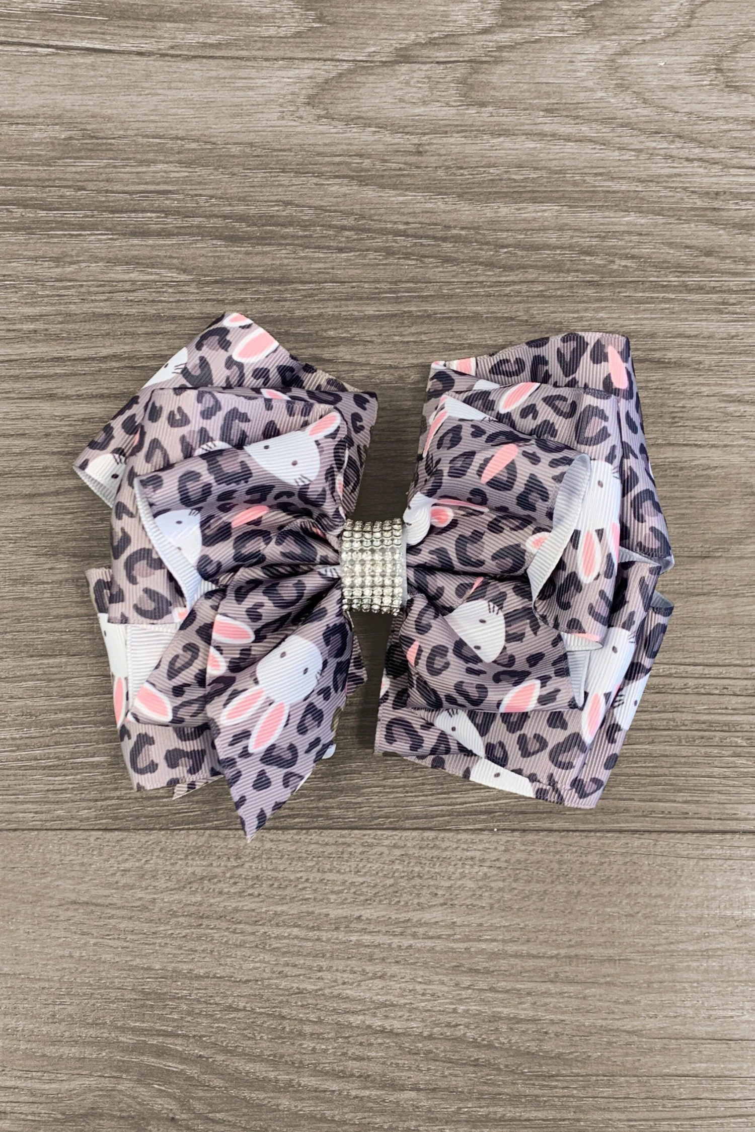 Get your locks ready for the Easter celebrations with this Leopard Bunny Rhinestone Bow. The clip is easy to add to your hair, whether you’re holding a few strands back from your face or decorating a ponytail. This hair accessory features a gray leopard & bunny design with silver rhinestone details. This bow is perfect for Easter & Spring wear!