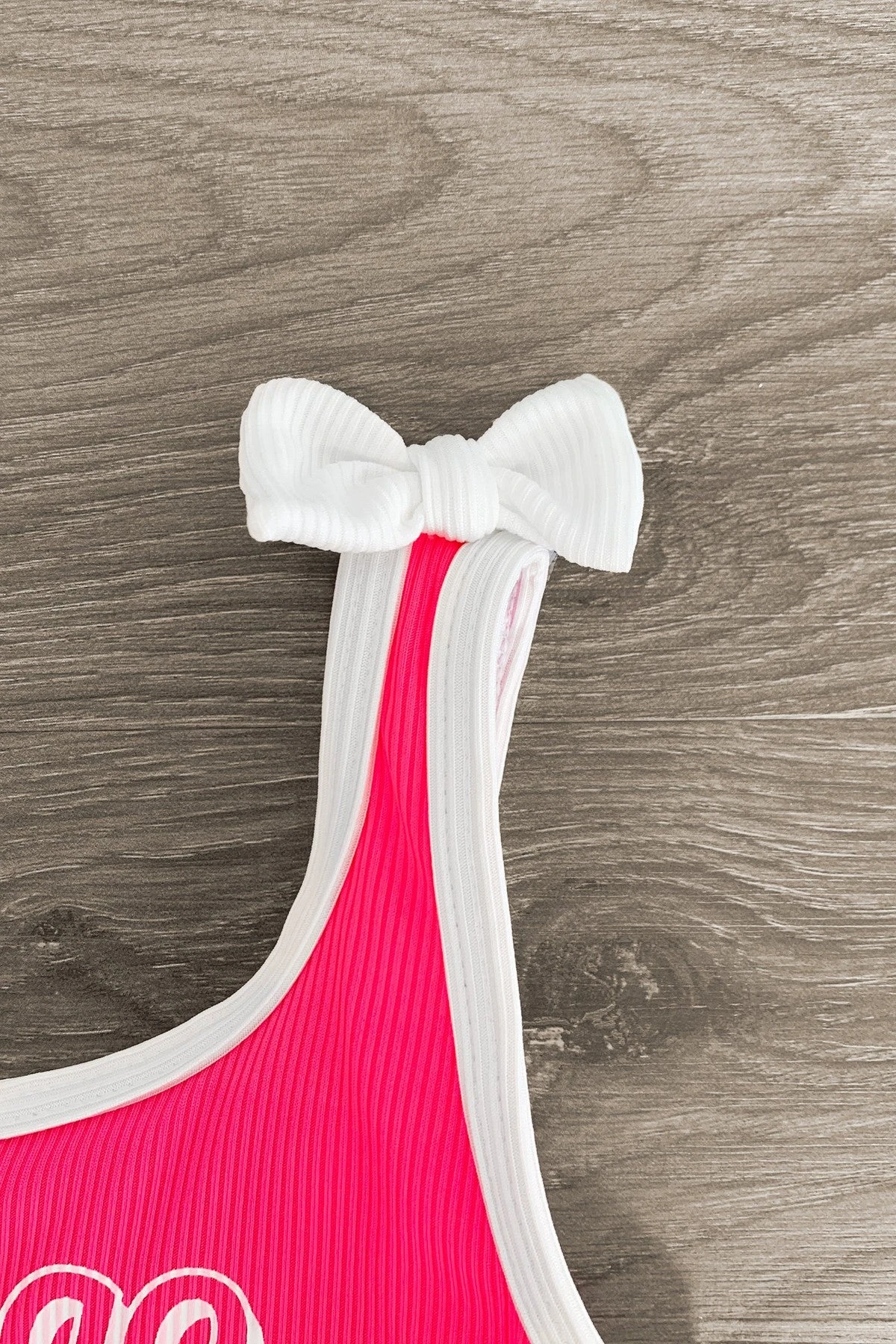 - Girls’ two-piece swimsuit features an adorable pink & white design