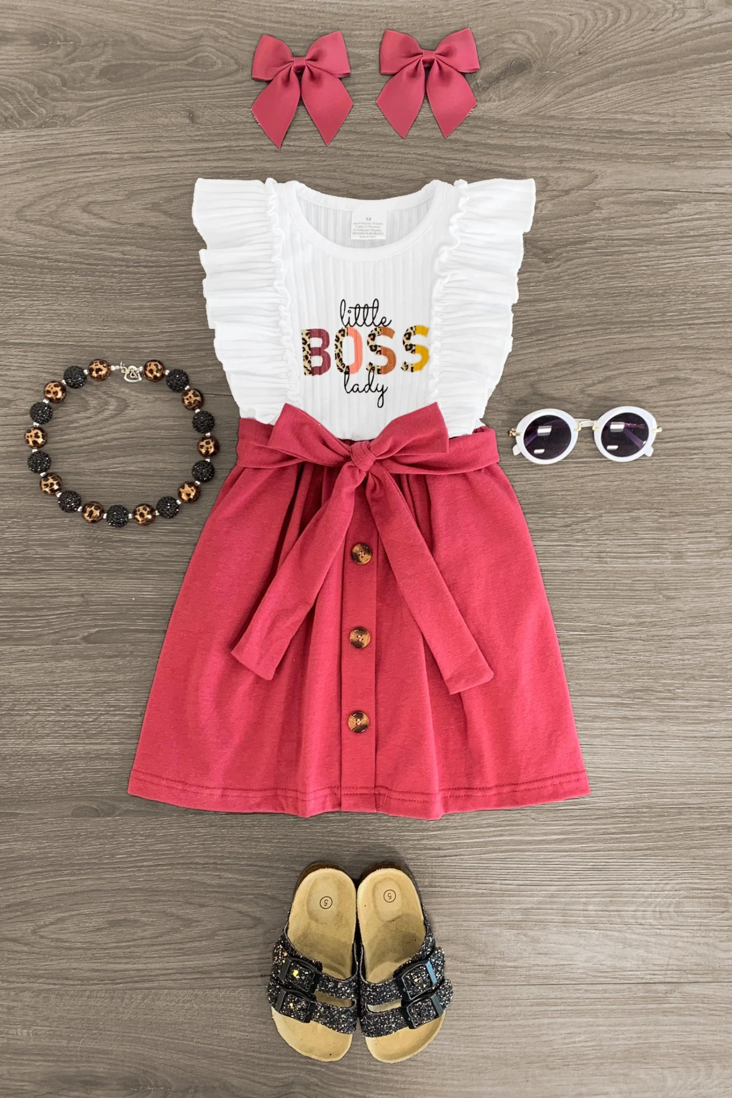 - Dress features a white ribbed bodice with “Little Boss Lady” on the front