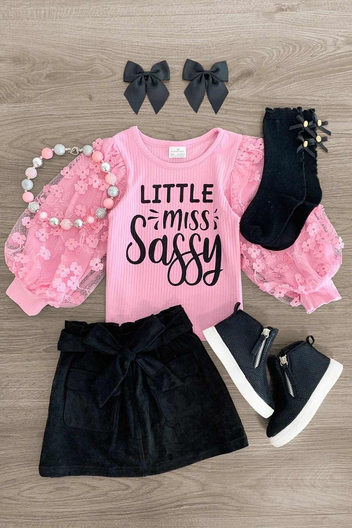 Add sweet style to her look with this “Little Miss Sassy” Pink & Black Suede Skirt Set for girls. The pink top features flower detailed puff sleeves with a fun saying on the front and looks adorable paired with the black suede skirt. The breathable fabric makes for cool and comfy wear, while the pull-on style allows for simple dressing. She can pair this set with booties or a matching bow for a cute look!