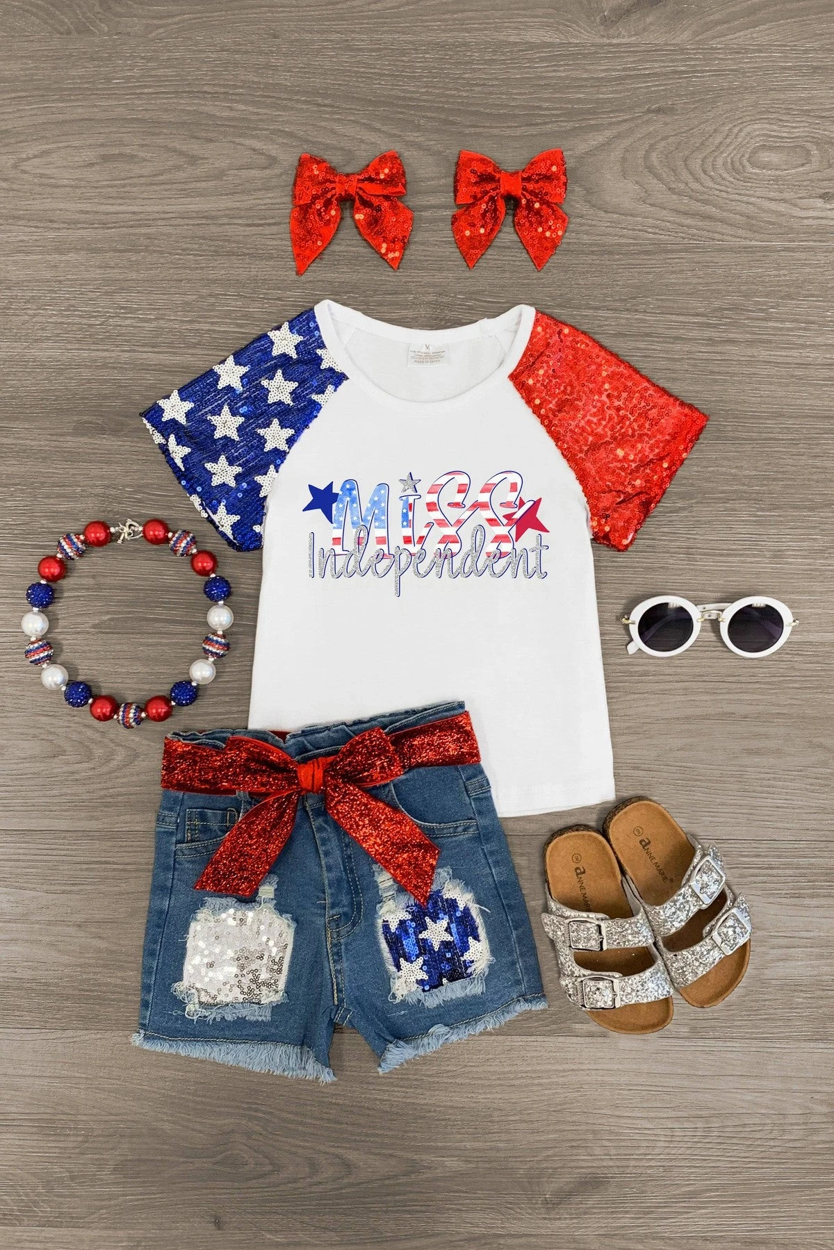 Bring on the warmer weather with this “Miss Independent” Distressed Denim Short Set for girls. This sequin sleeve top features a cute “Miss Independent” design on the front, and looks adorable paired with the matching peekaboo sequin denim shorts. The adjustable waistband & ribbon belt helps comfort and fit and can be great for on the go. The top and shorts can be worn as a set and paired with our sequin bows or keep it laid back with a pair of sunglasses, she’ll shine bright in this kids ensemble.