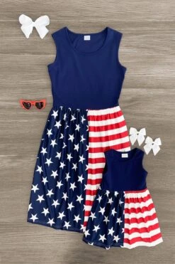 - Both dresses feature a navy blue bodice & American flag skirt attached