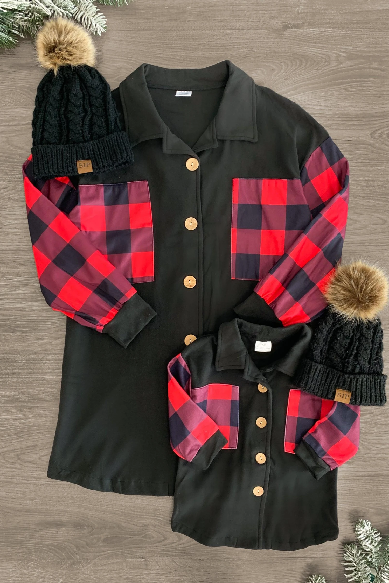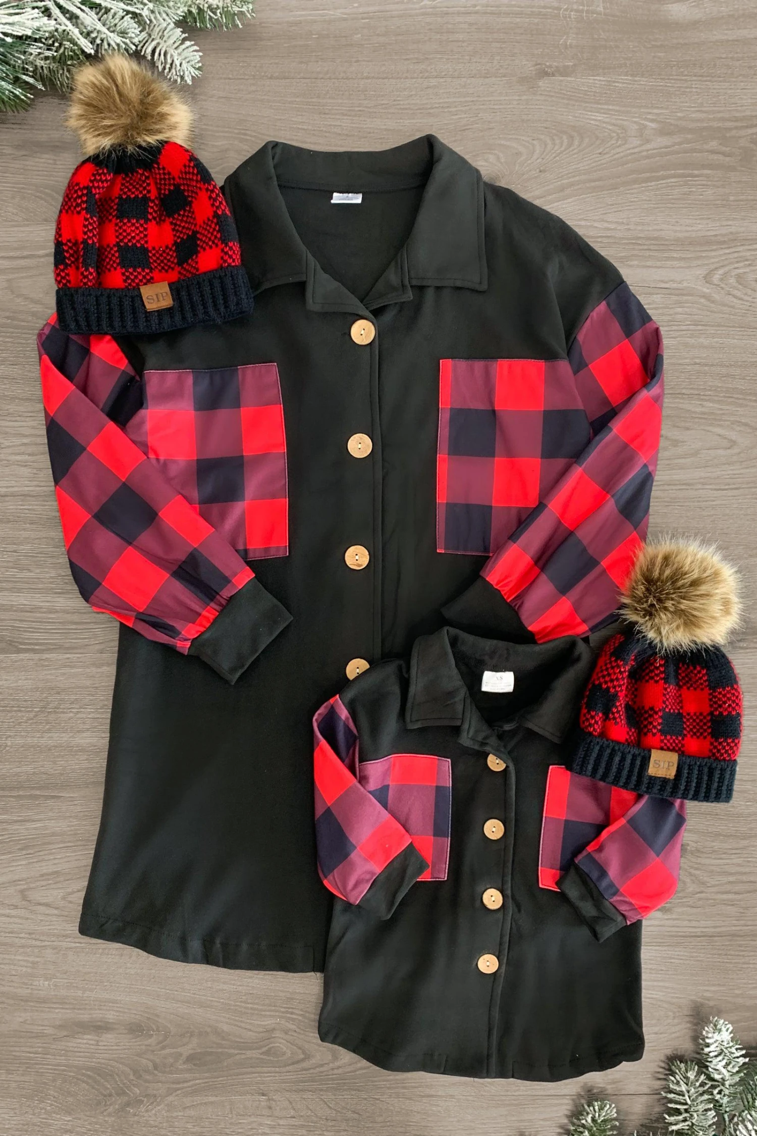 Twinning is winning, especially with your little mini me! You and your little gal will love the comfort and cool style this Black & Red Plaid Fleece Shacket brings to her Fall wardrobe. Made from soft & cozy fleece-like fabric, this shacket feels soft against her skin, while the long sleeves offer her a comfy fit. Pair this jacket with our matching bows or booties for the perfect look!