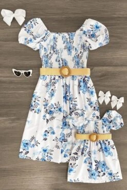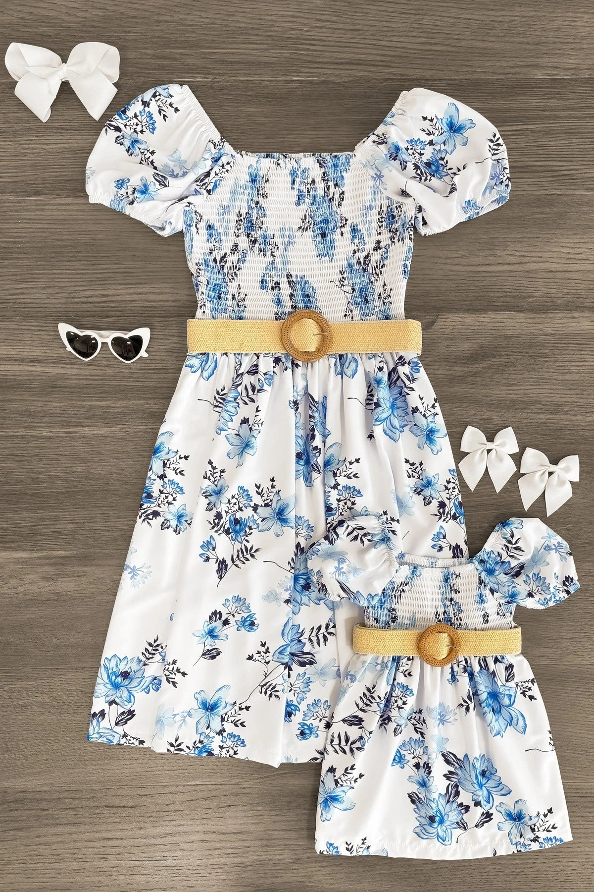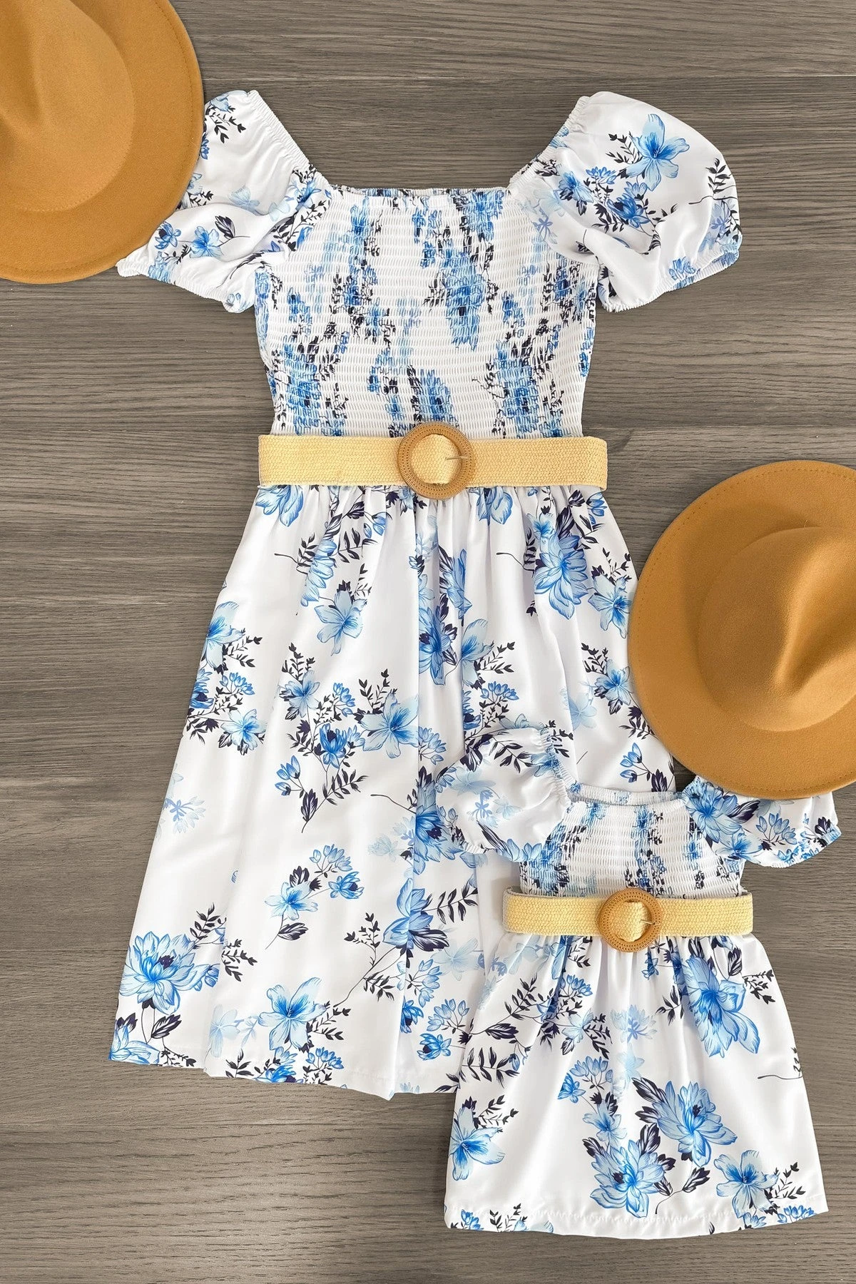 These Blue Floral Dresses feature an allover white & blue floral print with puff sleeves and a smocked bodice. The dress is made from soft and breathable fabric that will keep her comfy during all adventures. The belt offers a feminine fit, while the puff sleeves add a fun touch. She can pair it with some SIP bows & our sandals for the perfect look! Little ones love to match their mommy!
