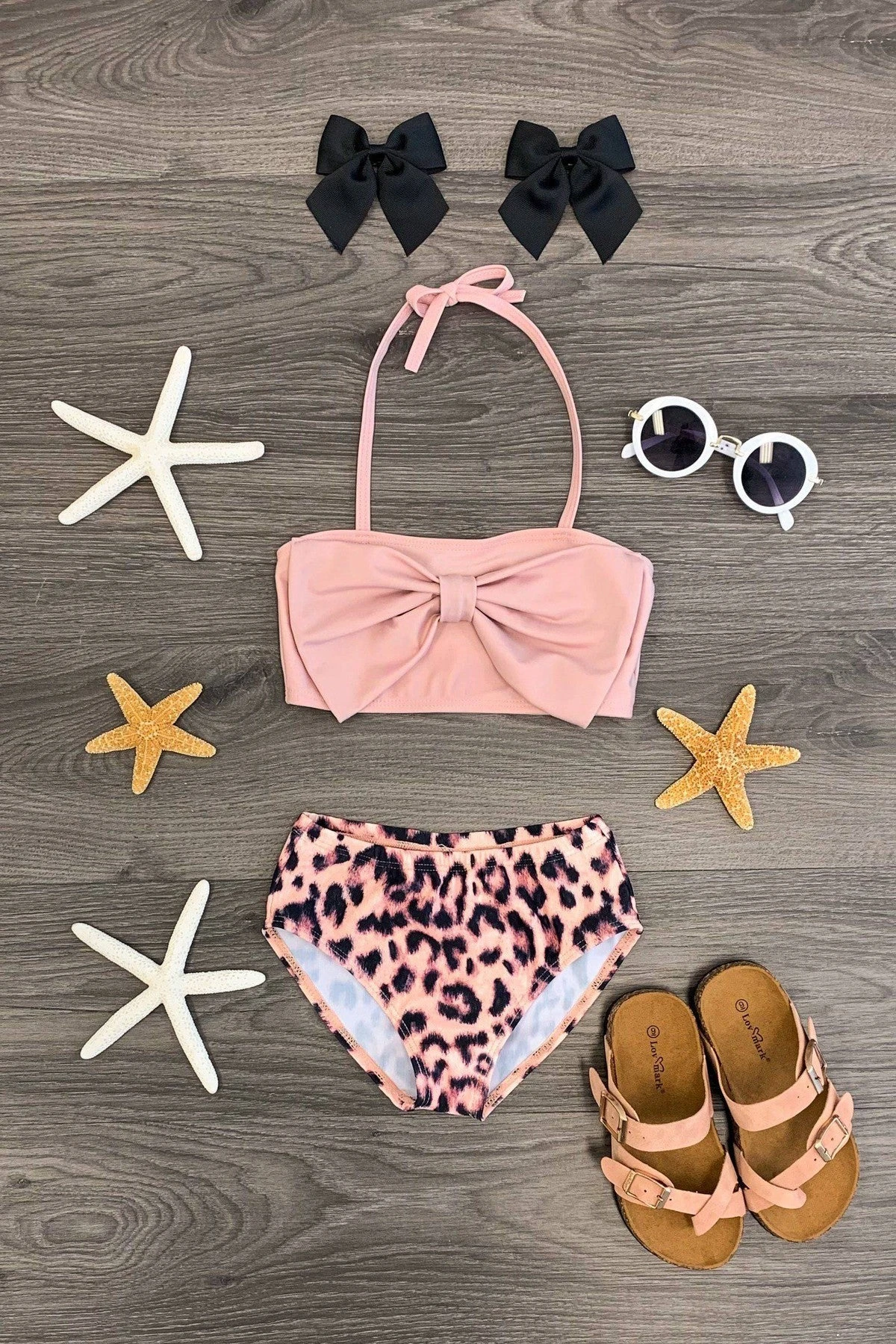 These Blush Leopard Bikinis features a bow halter tie top, and is paired with matching blush cheetah print bottoms. In a versatile print, this set is made from soft and breathable fabric that will keep her comfy during all adventures. She can pair it with a variety of SIP bows or sunnies for the perfect look! Little ones love to match their mommy!
