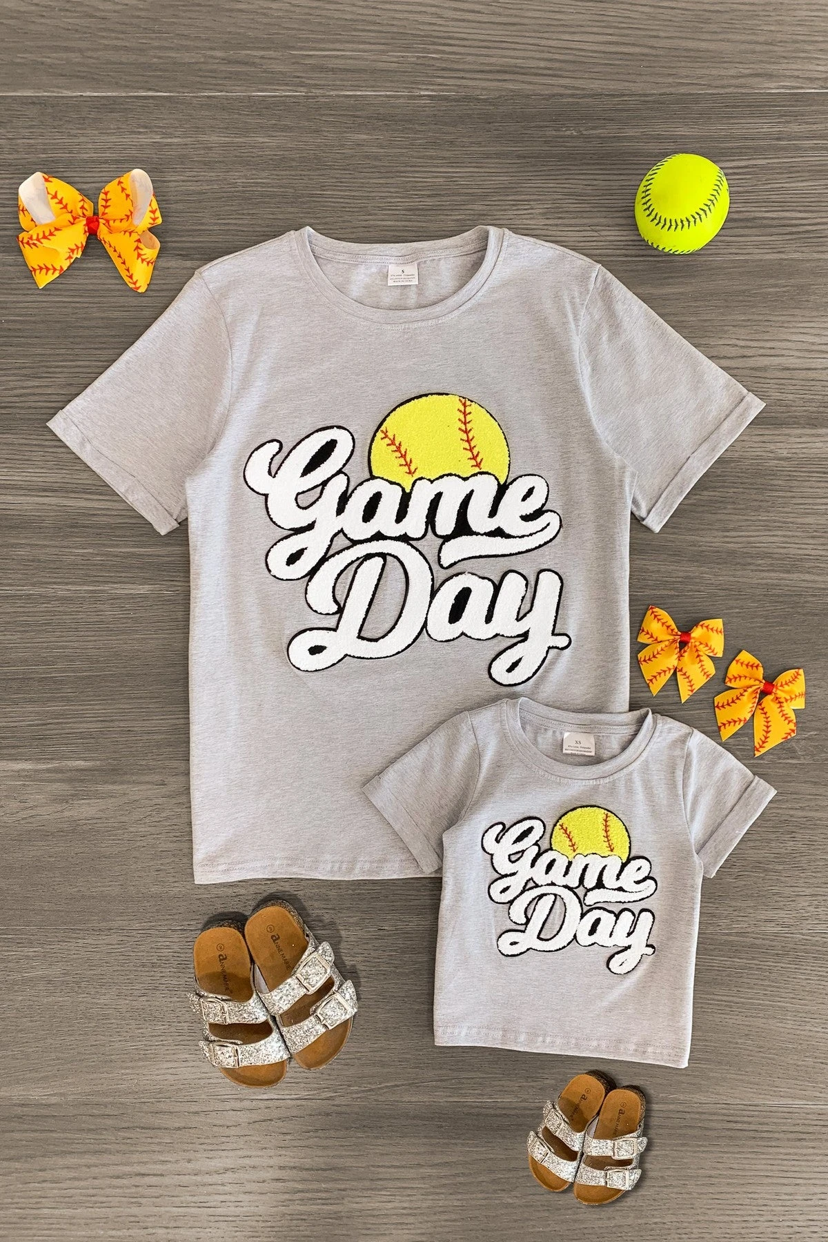 - Mom & child tops both feature a baseball chenille patch on the front